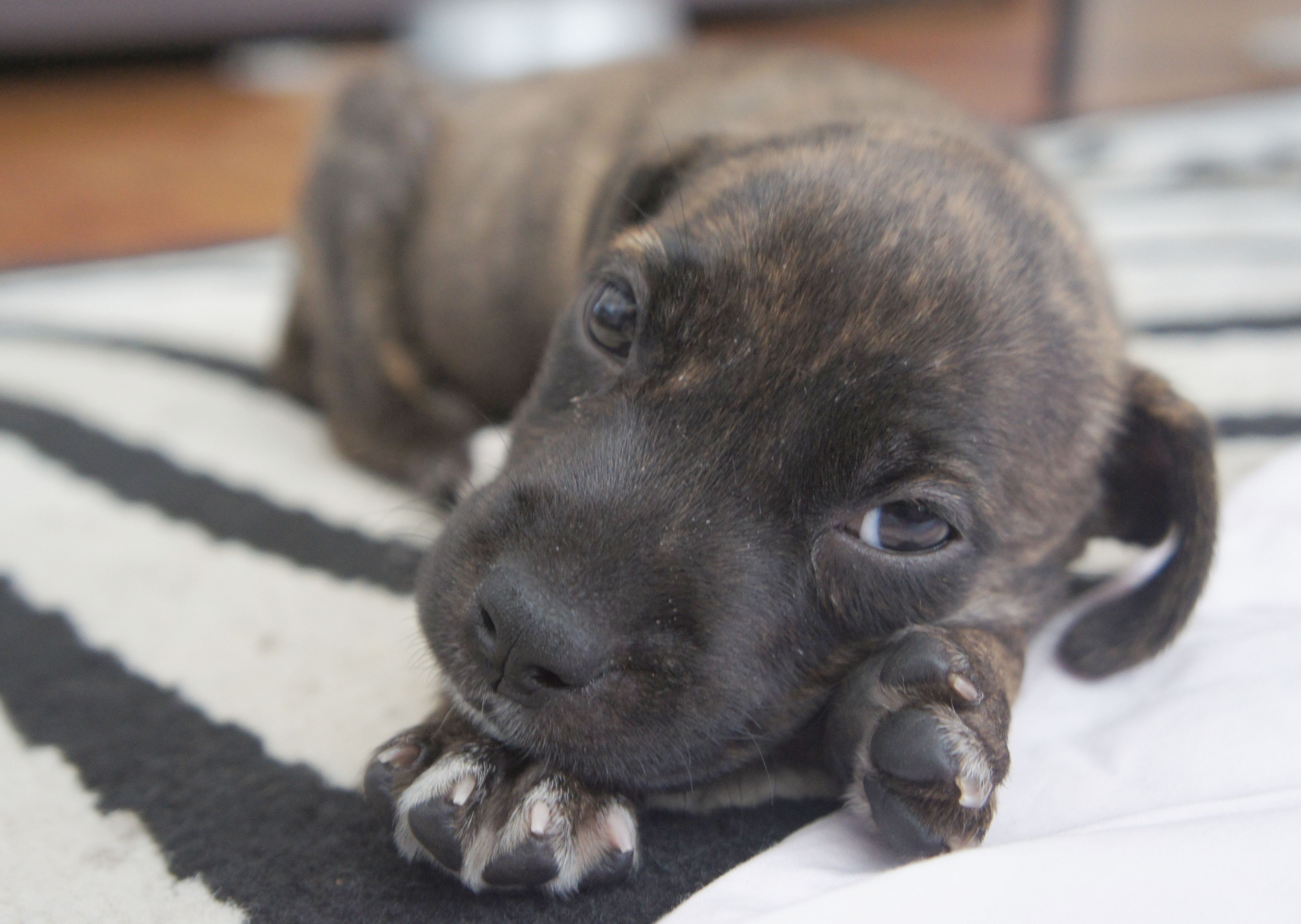Eowin is a gorgeous 9 week old, female Staffy X puppy. She loves to show you what toys she has and run around the house with them. Eowin will lay on her back and go to sleep or she enjoys to be carried around in your arms. She has super soft fur and big black eyes that will melt your heart.