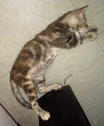 More of your inside loungeroom kinda cat, Motley has an unusual coat and is quite striking. She has a lovely spotty tummy and loves to play with toys and ropes. She is a smaller, finer framed little cat and will probably stay that way into adulthood.