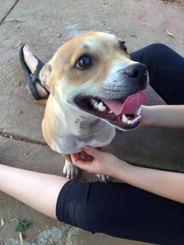 Lovely little Poppet !!. Poppet loves attention and is only aprox 8months old. She is good with children and other dogs. She is a small dog, perhaps with a mix of chi x staffy. She is a very sweet pint sized pup!