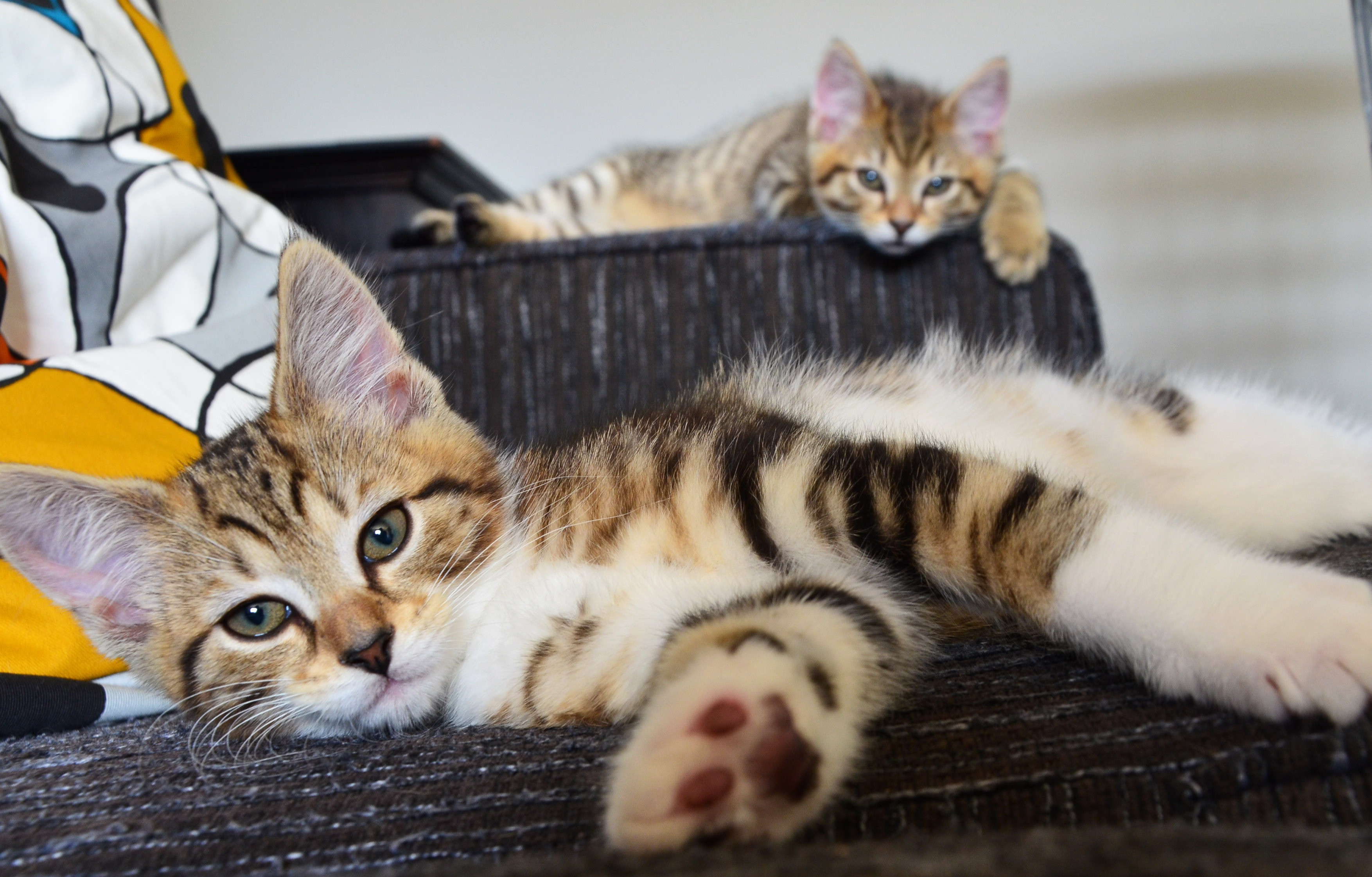It is impossible not to fall in love with Archie in minutes - he has so much character and is full of beans. He loves to play all day with his brother, toys, feet, and people. He will sit for a cuddle and belly rub in your lap when he settles down, but just loves attention a lot of the time.