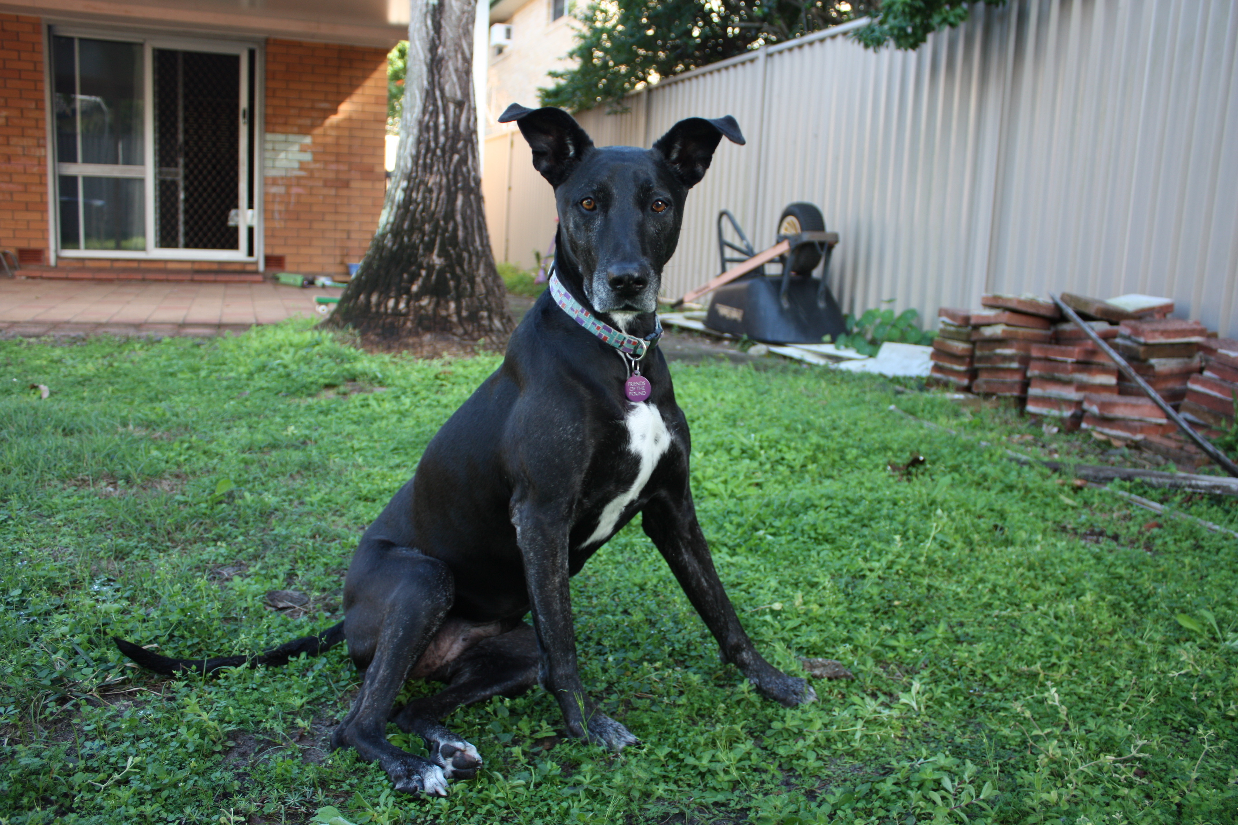 Yollie is an 8 year old desexed female staffy x dane. She is a sweet natured dog who loves other dogs and is good with children. Weighs about 35kg.