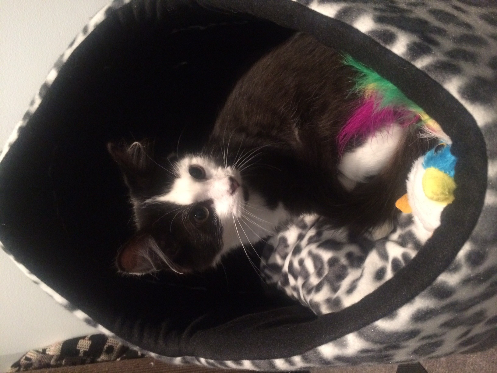 My foster mum works during the day and I happily amuse myself until she gets home. I love to just hang out in the same room as her- I will happily curl up for a nap or play on my own if she is doing something that I can’t be a part of, like making dinner. I have a foster brother & sister- we peacefully hang out & have dinner together, but they aren’t at all interested in playing with me. Their loss! I will be fine in a home that has cats as long as I can still get my snuggles!