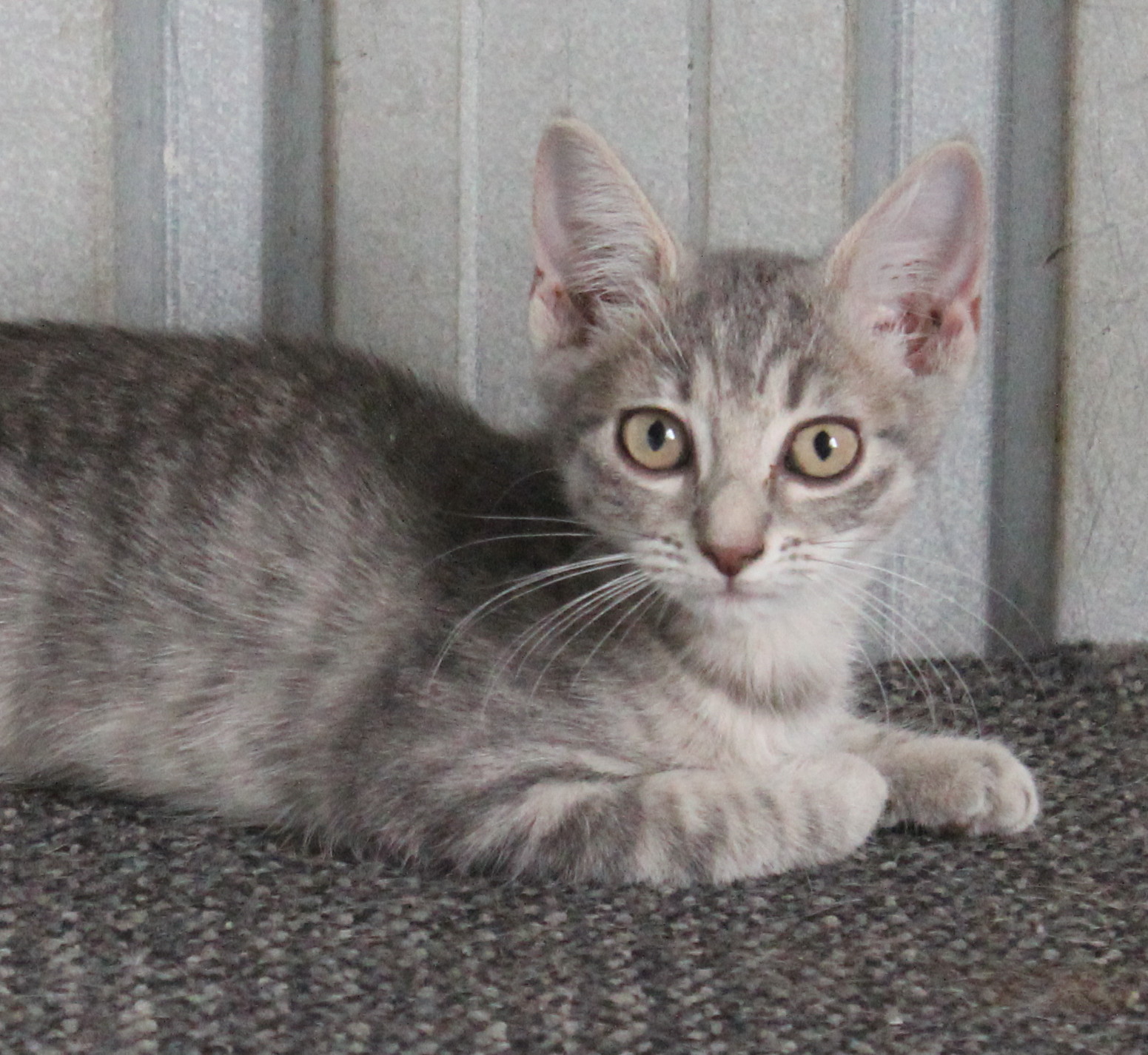 She is a gorgeous silver tabby with very cute big ears. She doesn't really like being patted or picked up, and would suit a family with another cat, where she can just "be herself"