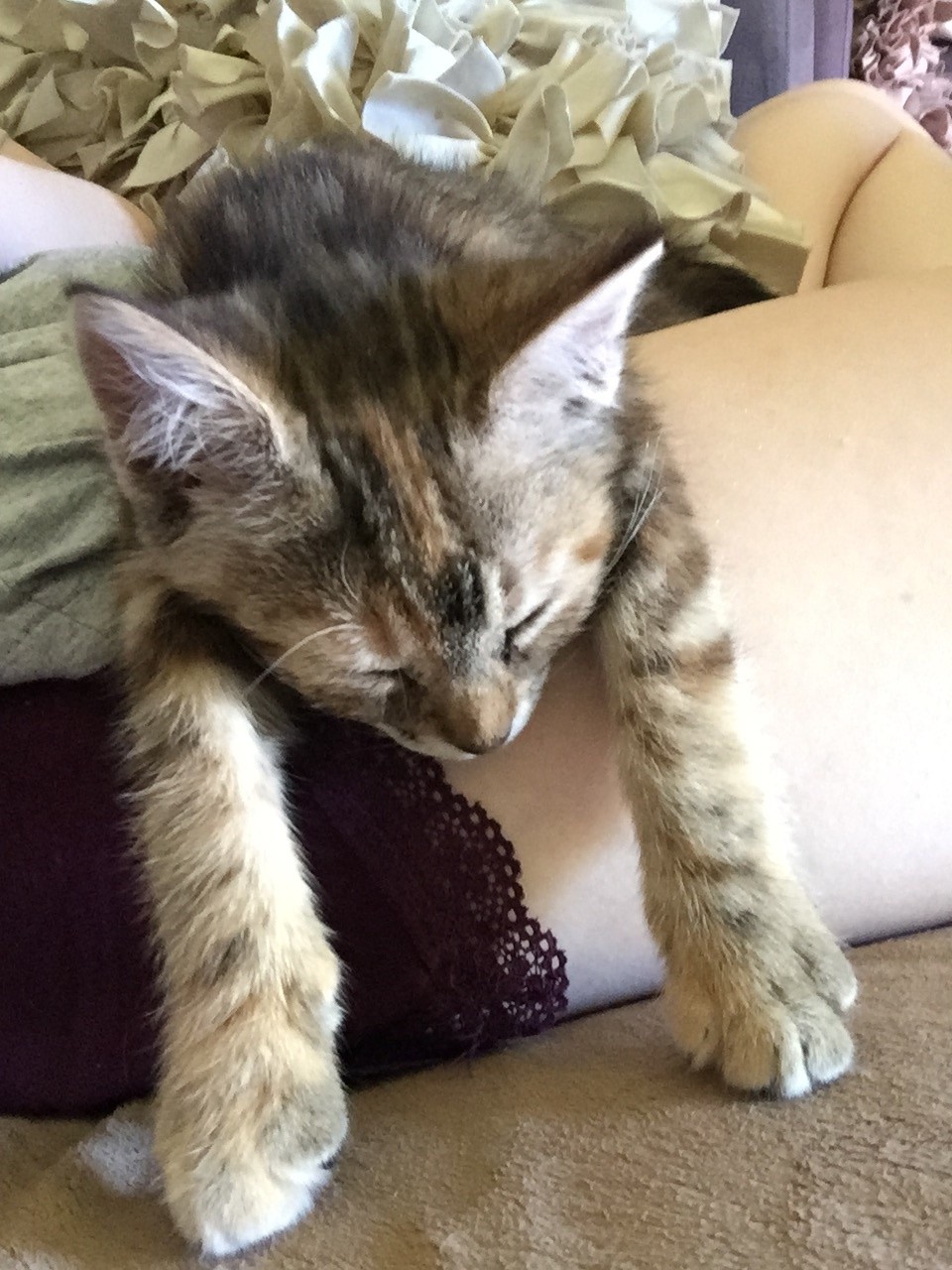 She is a very enquisitive and loves to be around people. She mostly spends her days playing with her toys or lounging around. Quite often she will fall asleep in your lap or cosy up next to you. Arya loves cuddles and is quite affectionate, and when she is in the mood for being picked up and cuddled, she starts purring almost instantly! Despite her love of being around people, she is also quite content to entertain herself either with her toys, pouncing on anything that moves or darting after you as you walk around.