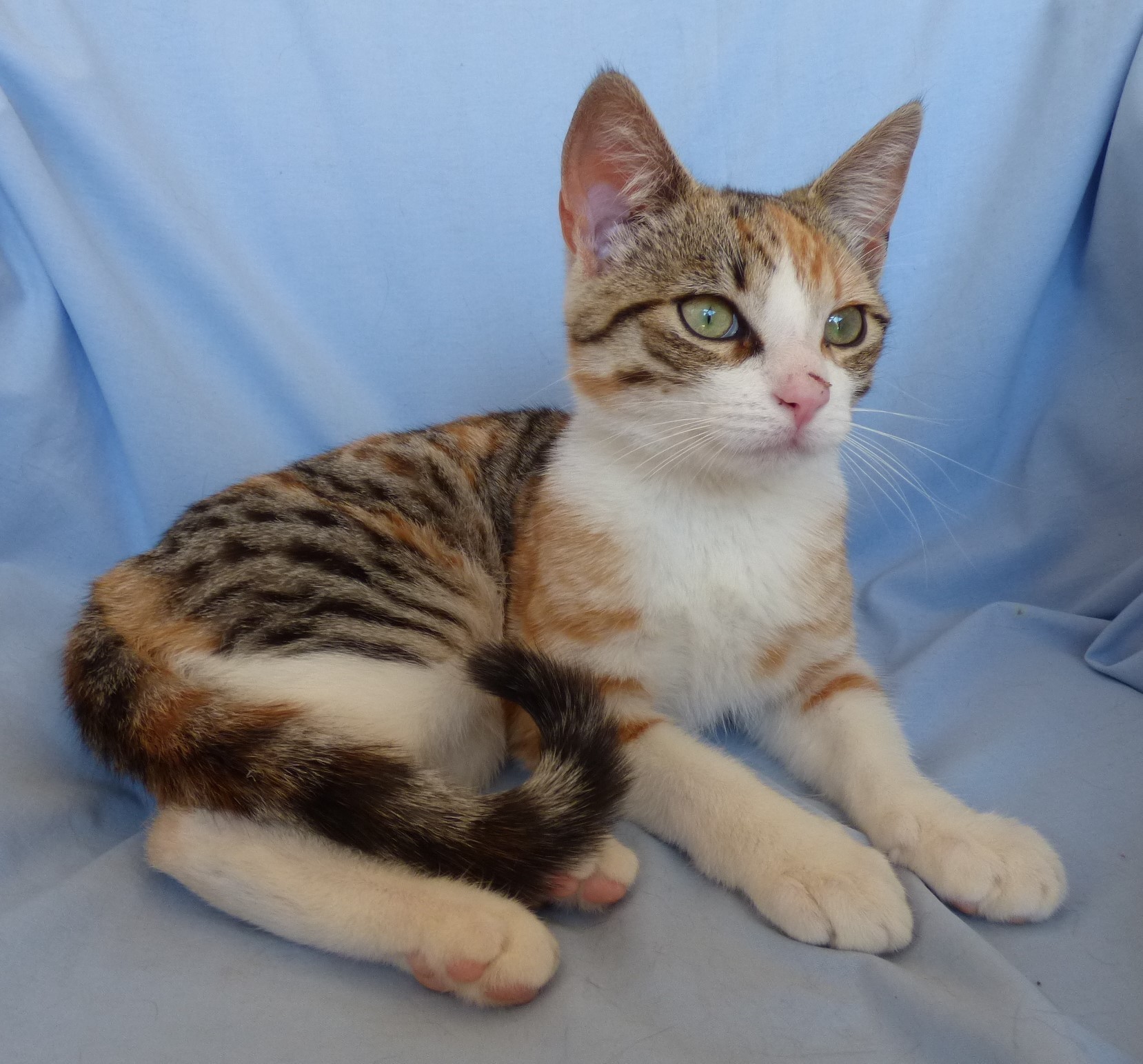 Meet Jewel (C087) the female domestic short hair Tabby/Torti kitten. Vets estimate Jewel to be between 12 and 16 weeks of age.