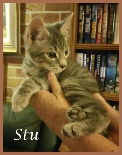 Stu is known by his foster mum as "Mr Cheeky". He is a lovable kitten who looks you in the eyes when being patted. He is a runner, but loves to play with his brothers.