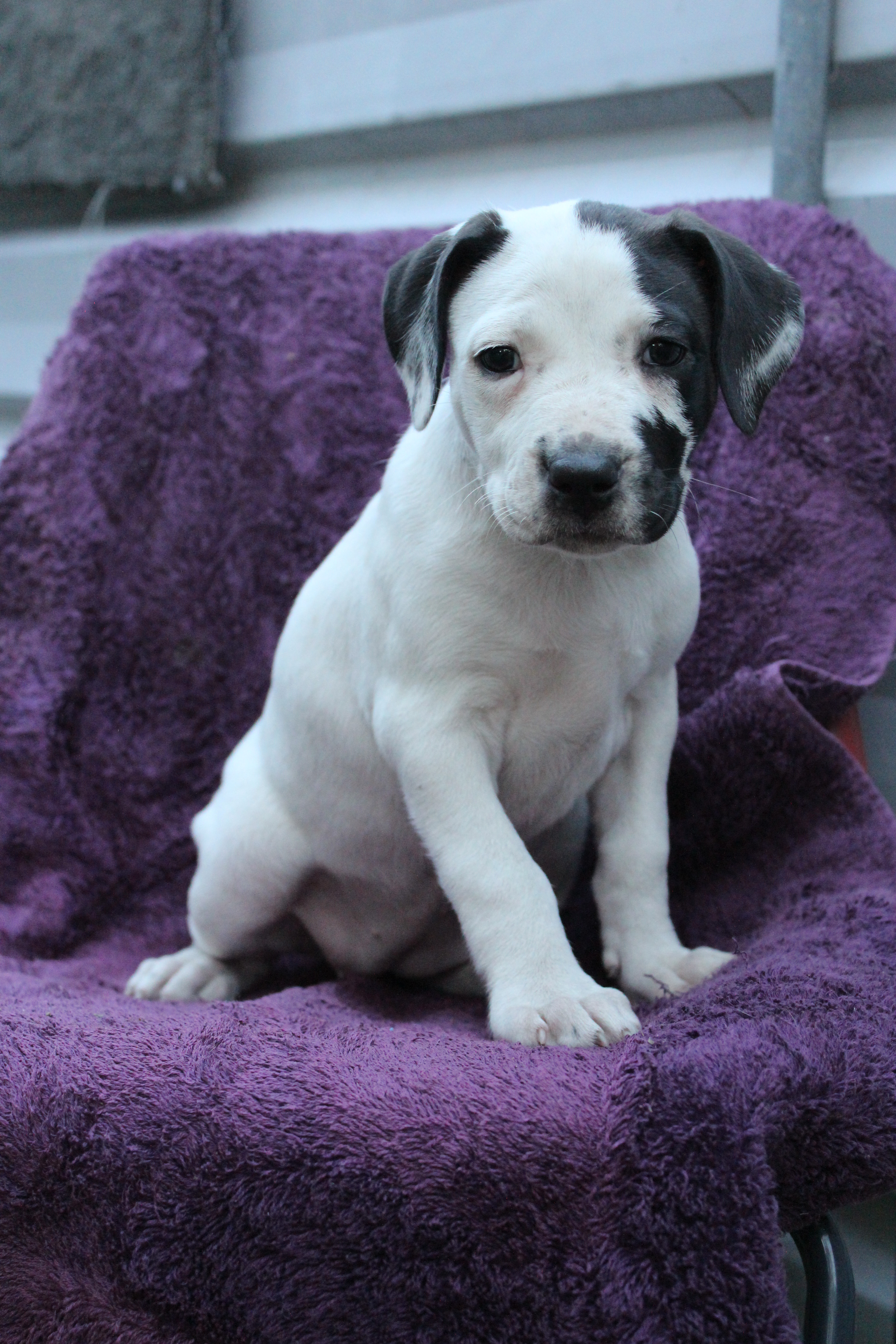 Her parents were mixed breeds, medium sized dogs. Known breeds include Great Dane and American Staffy but I wouldn't get too caught up in that, there is far too many breeds mixed in to make judgement.