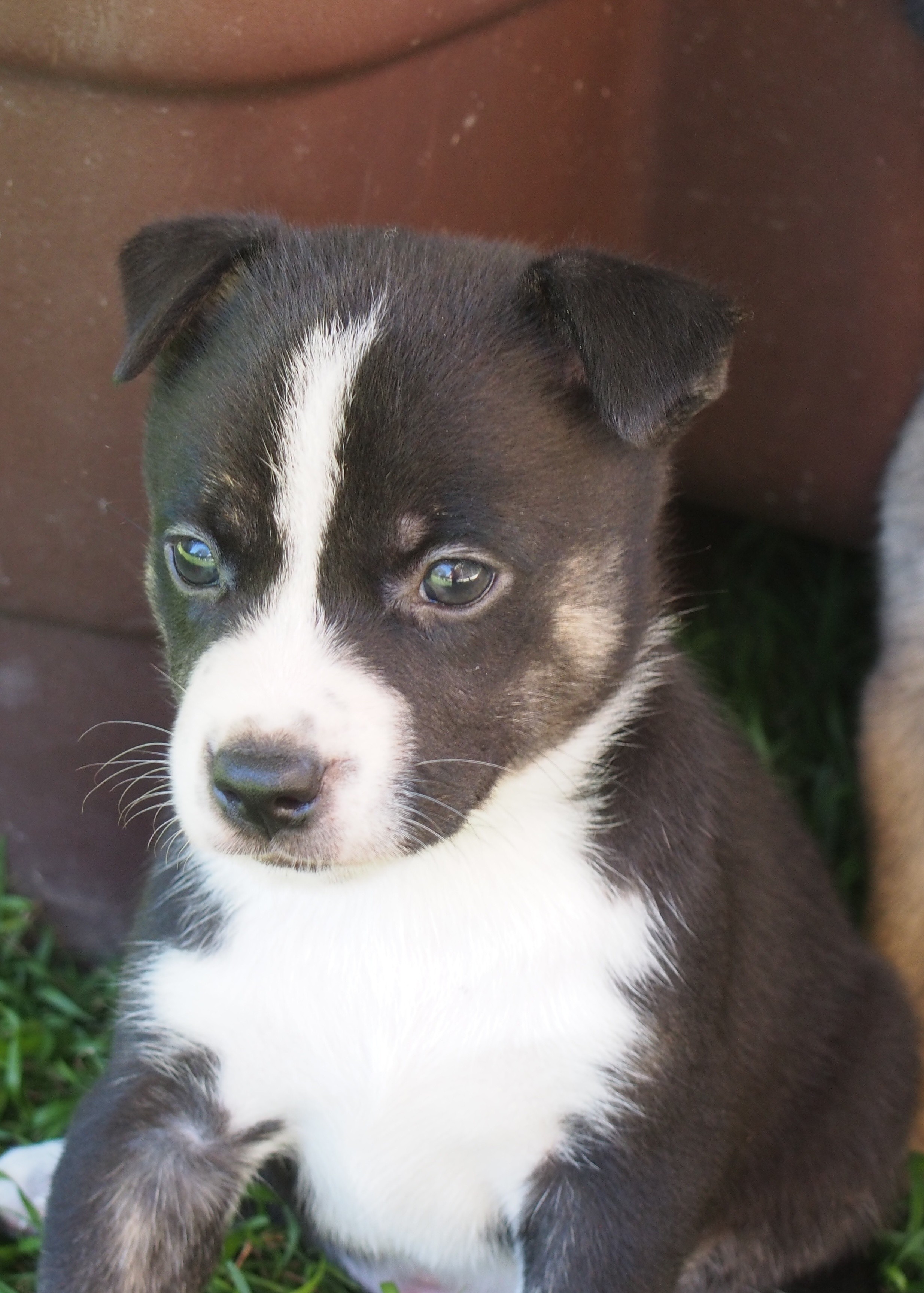 His mum is an English staffy but dad is unknown. Some of his siblings have blue eyes so it has been suggested - border collie/husky/coolie (or a mix of these perhaps). Taking this into consideration, we are assuming he will grow to be on the large side of medium - not a huge dog but probably around the 25kg mark.