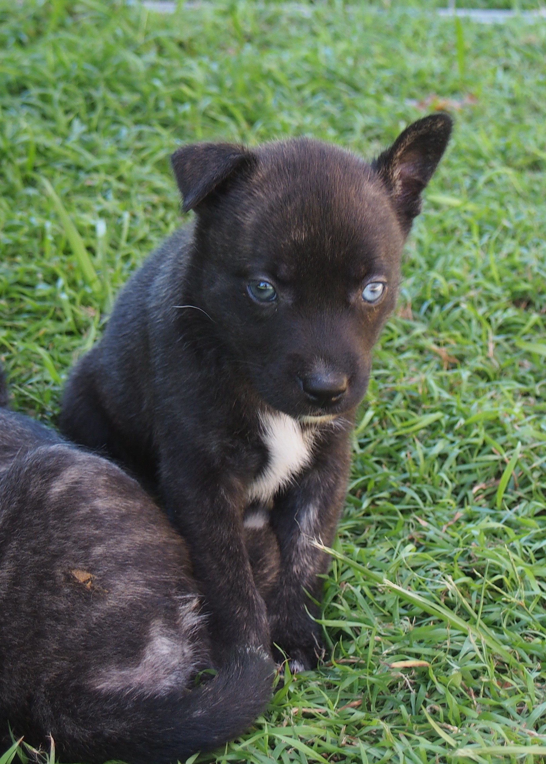 Her mum is an English staffy but dad is unknown. Some of her siblings have blue eyes. Evie has one blue eye and one brown eye so it has been suggested - border collie/husky/coolie (or a mix of these perhaps). Taking this into consideration, we are assuming she will grow to be a medium dog - probably not as big as her siblings but around the 20kg mark.