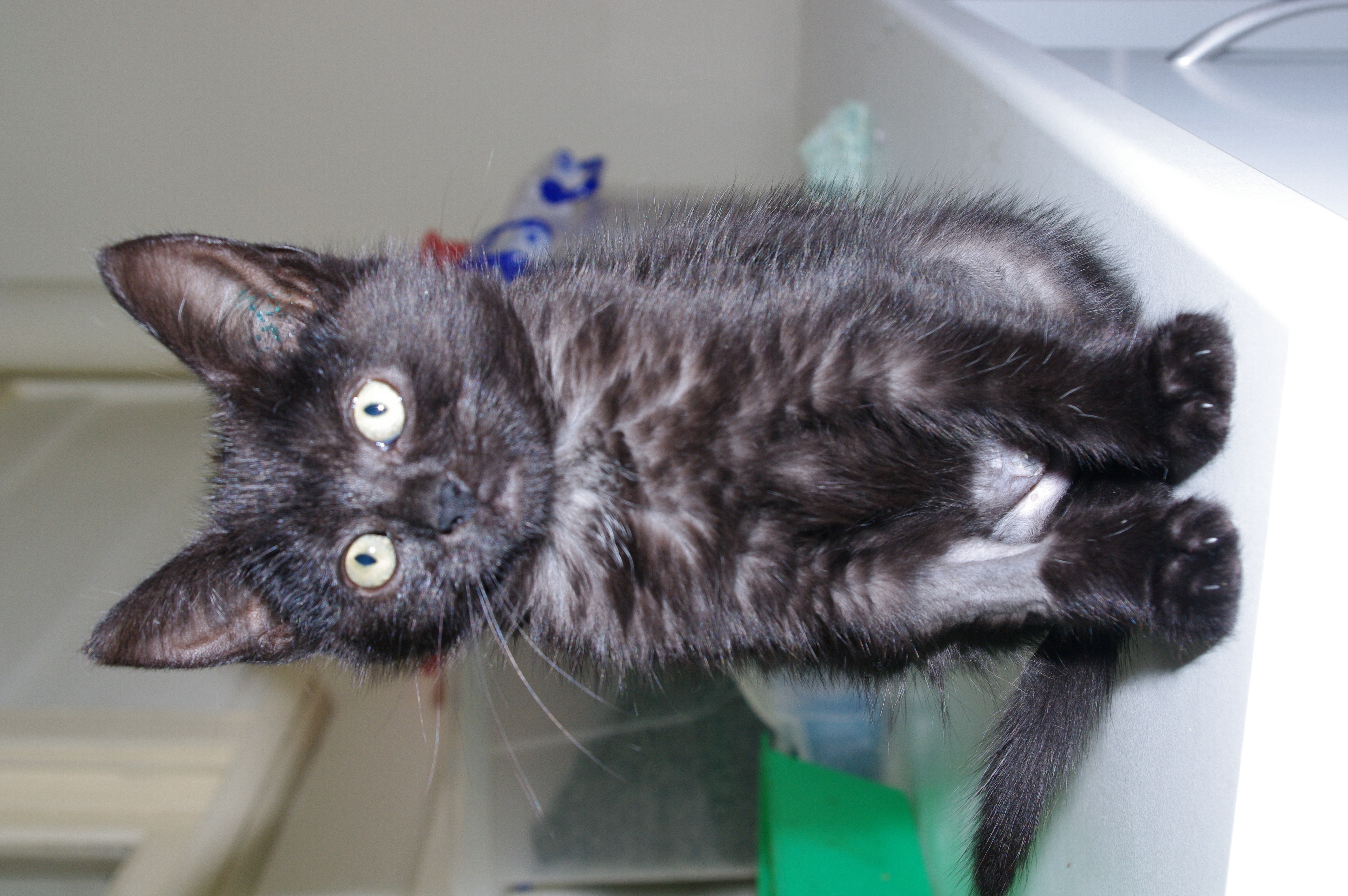 Georgie is 8 weeks old, she is black with a small white area on her chest. Georgie is a playful kitten, she interacts well with her foster kittens and would be well suited to a household with small children.