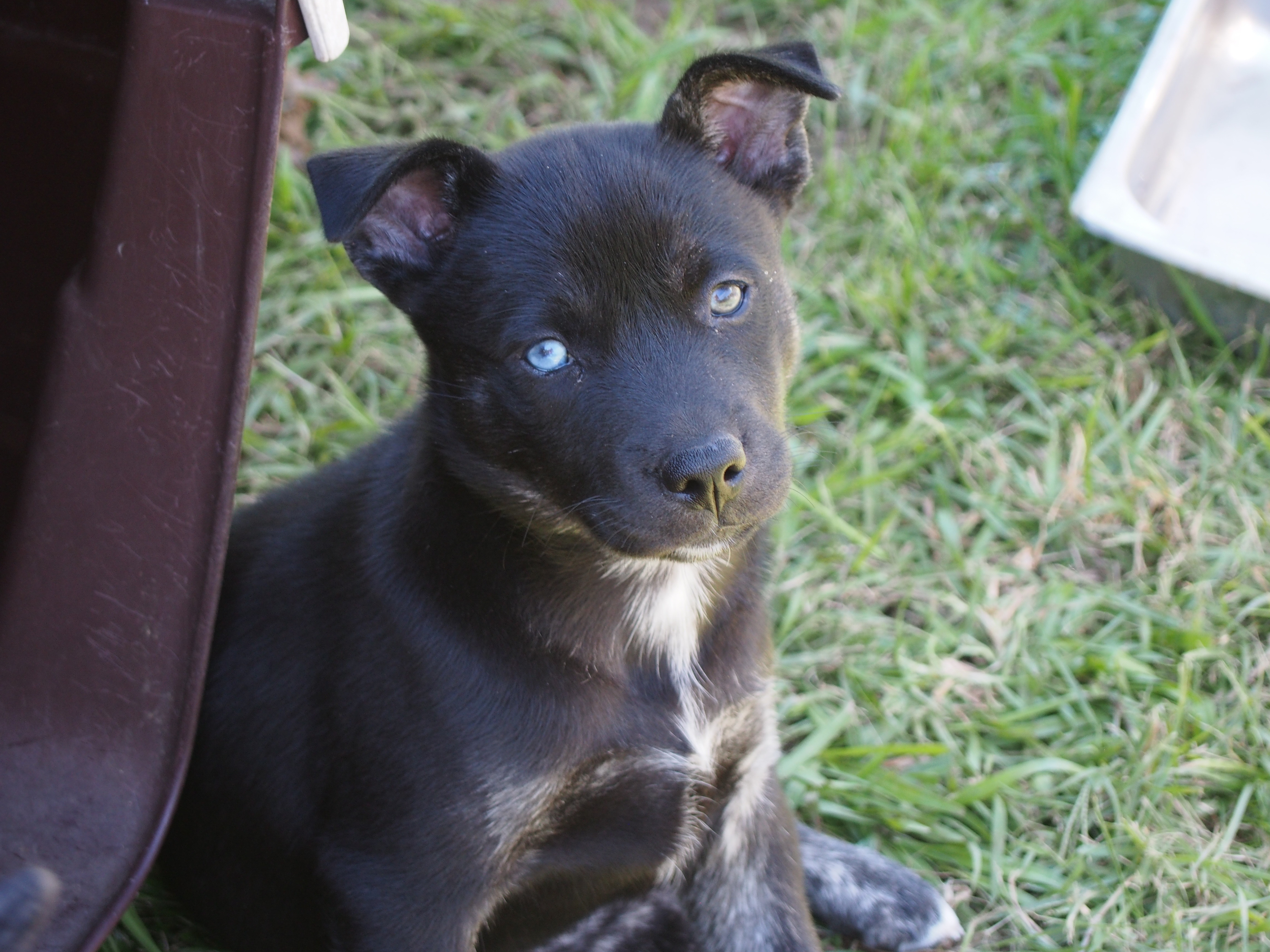 Her mum is an English staffy but dad is unknown. One of her siblings had two blue eyes. Sasha has one blue eye and one brown eye so it has been suggested - border collie/husky/coolie (or a mix of these perhaps). Taking this into consideration, we are assuming she will grow to be on the large side of medium - maybe 25kg mark.We would also assume she will have the exercise requirements of these breeds.