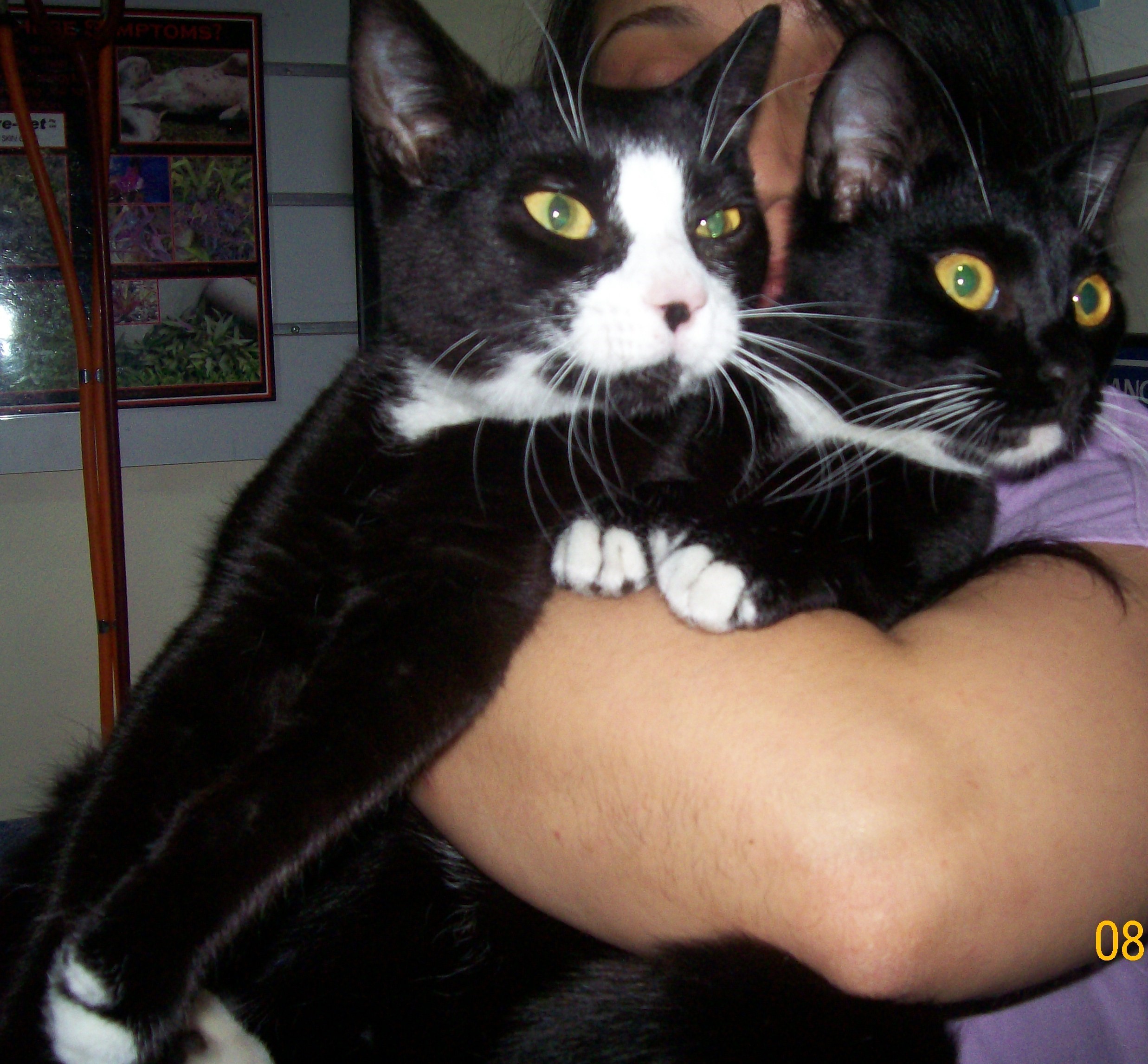 Bandita and her brother Bibby are 7 months old with lovely striking "tuxedo" markings (Bandita has the spot on her nose and Bibby has a white bib), who are real little scamps. Friendly, sunny natured, and complete cuddlebugs. Bandita is sweet natured and placid, Bibby is a bit more outgoing, independent yet quite loving.