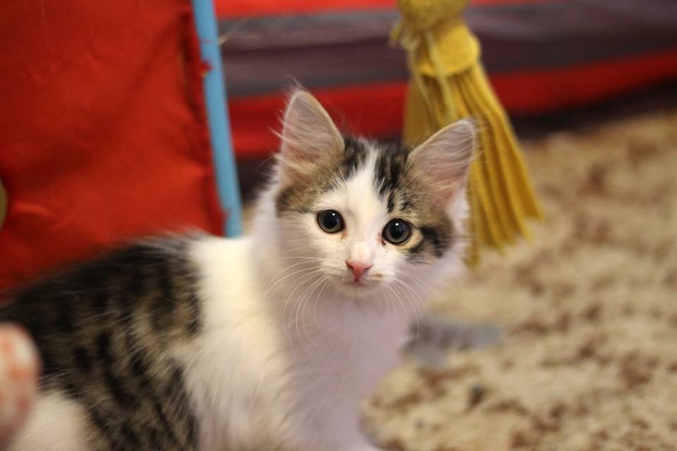 Sparkles is a sweet young kitten. She enjoys sitting on people's shoulders and generally enjoys people's company. She is a quiet and relaxed kitten but does like play with dangly toys.