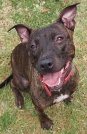 Hello, my name is Blue and I am a one year old Staffordshire Bull Terrier mix. I am a friendly girl who would love nothing more than to become part of your family. True to my breed, I am very people oriented and would make a great loyal family pet. My happy attitude to life is infectious and will turn your frown upside down. As you can see from my photo, I always seem to smile at the little things and I know that my grin will not disappear when I find my forever home.