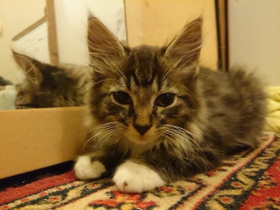 Ziggy is such a handsome ragamuffin of a boy! He is going to grow into one hell of a stunner. He's a smoochy, cuddly bear. He likes other cats, dogs and humans, although he is a little scared around a lot of noise but then he's only a kitten. He loves lap time and playtime and also laying on the bed beside his foster carer. He's just an all round sweetheart