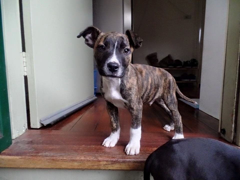 Rumble is a beautiful brindle male Amstaff with little white socks and a white chest. He is extremely playful and always up for some fun. He is extremely adventurous so will need a home that has no 'escape holes'. Rumble has been vaccinated, wormed, and will be microchipped in the next week. Rumble is a strong healthy boy and loves his food. He loves to play with his brother and sister but then will happily take a nap with the rest of the dogs all cuddles up together. Rumble will grow up to be a larger Amstaff judging by his feet.