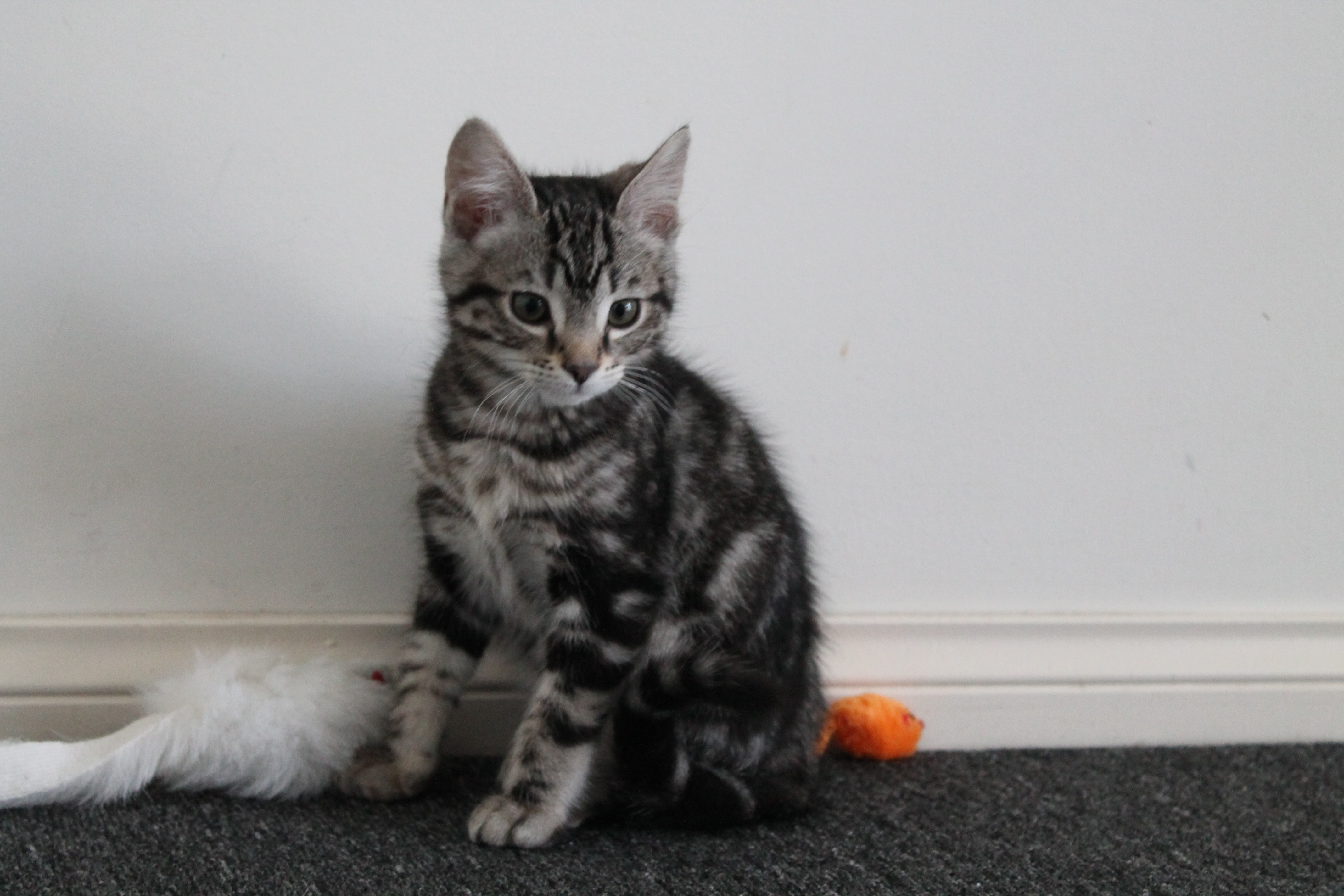 READY TO GO- Big boy Rigby is the boss! He could wrestle and play all day and is a ball of energy. He loves his toys and is regularly found on his scratching post. He can be rough with the other cats but knows his limits with people and is reasonably gentle. Nothing beats feather on a stick! He will chase and chase and chase!