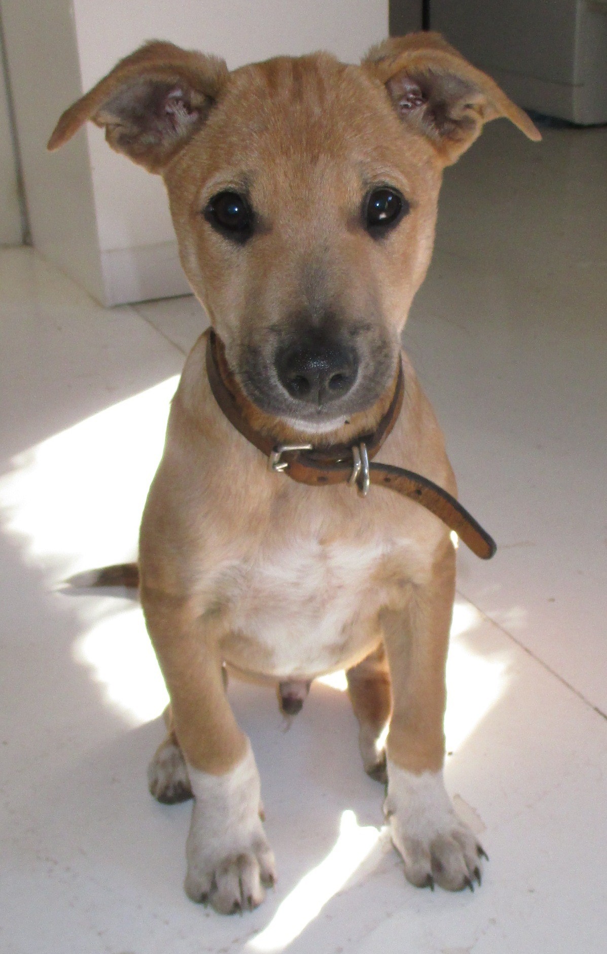 We have no idea what breed he is so are just making a guess that he is possibly kelpie cross of some kind and with his colouring perhaps there is some Labrador cross in there some where??? He does not have large paws so estimate he will be a small to medium sized dog. Perhaps the size of a small kelpie if not smaller. He is currently the size of a jack Russell.