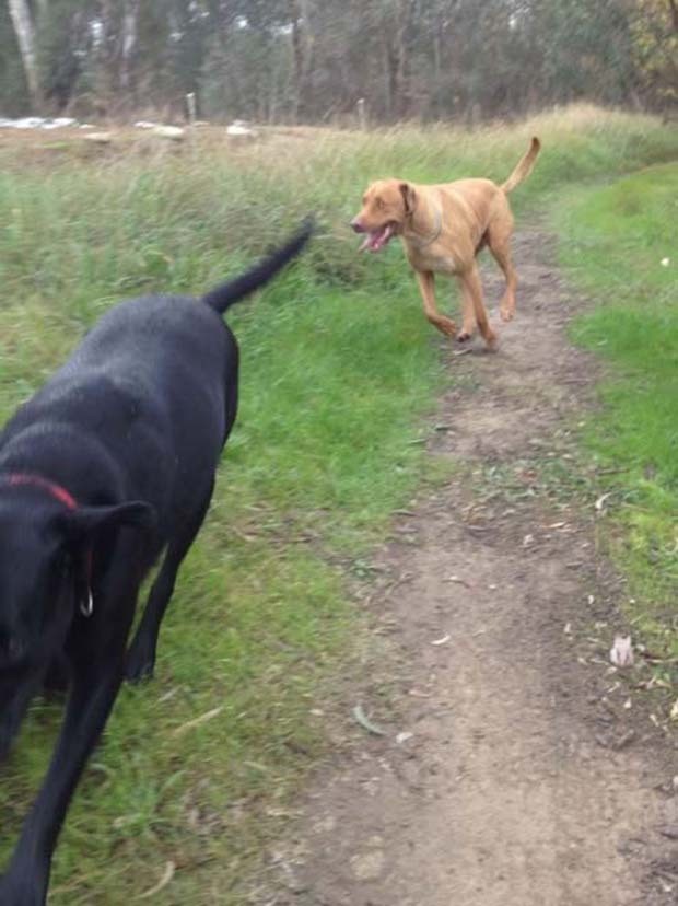 Off the lead he loves to play and run with other dogs but because of his size some dogs can be a little overwhelmed by him.