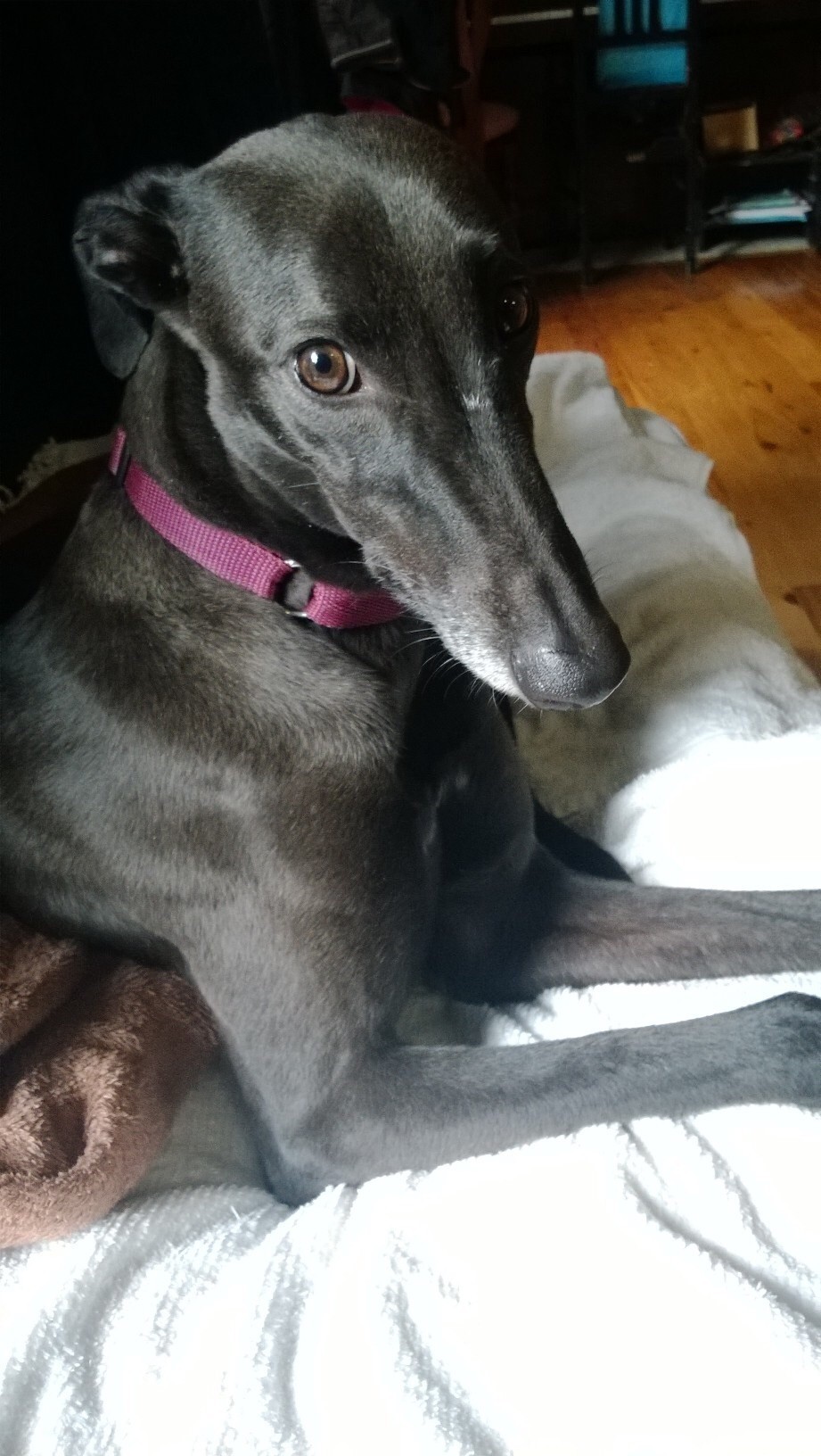 Cassie is a small girl and has the softest coat, especially around her ears and neck. She is registered as black, but in reality seems to be almost chocolate in colour. She is a gorgeous girl.