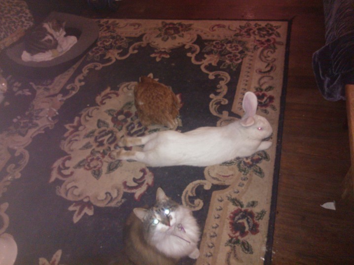 From the photos you can see I'm pretty handsome, if I do say so myself. I'm as white as they come with big big ears. You can also see me comfortably next to a cat and a chicken that I get along with pretty well. The chicken doesn't like me because I sneak up on her (she's blind so it's easy) and the cat generally ignores me.