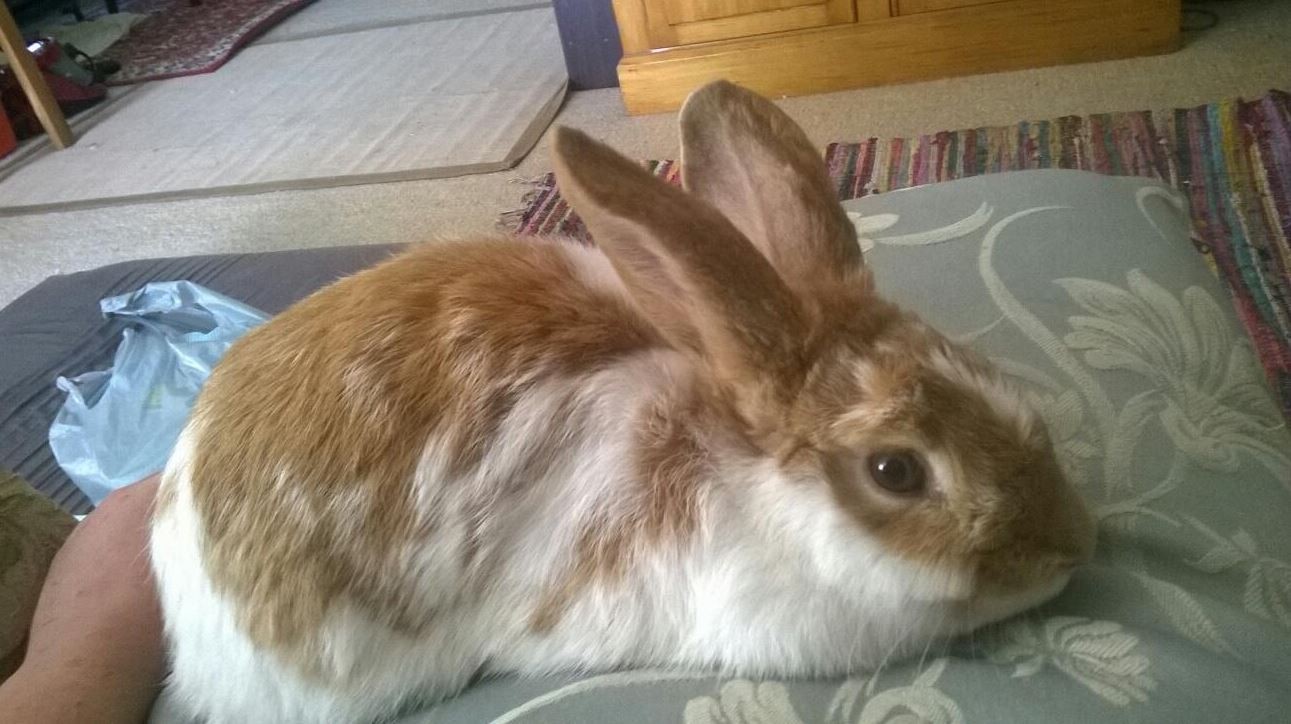 I am a gentile and friendly rabbit. I was rescued by a lovely lady hoping to bond with her bunny boy but didn't get along. I would much rather have a human companion or a nice boy bunny to snuggle up to. I really love to hide in cardboard boxes and nibble holes in them. I will jump up on the couch and watch TV with you and lick your hand if you let me.