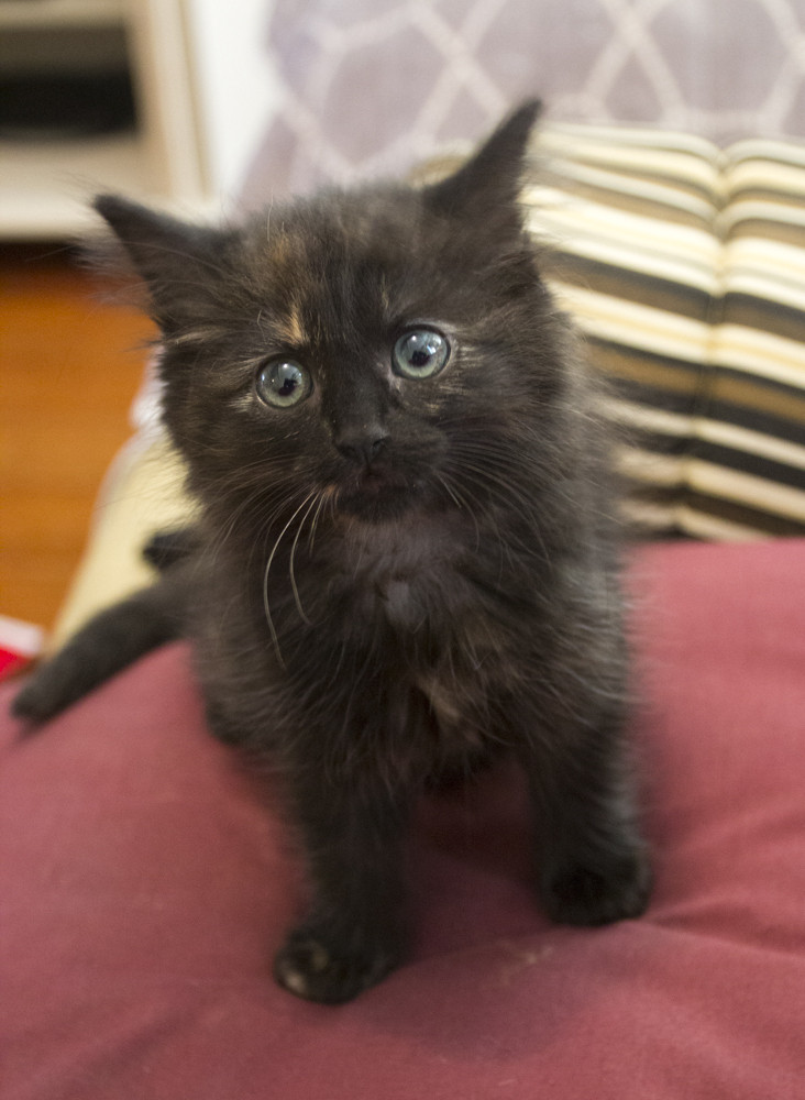 Biscuit is an adorable little tortie girl rescued from the pound with her sister Cinder and brother Dudley. She has the sweetest personality and is great with cats of all ages and kids.