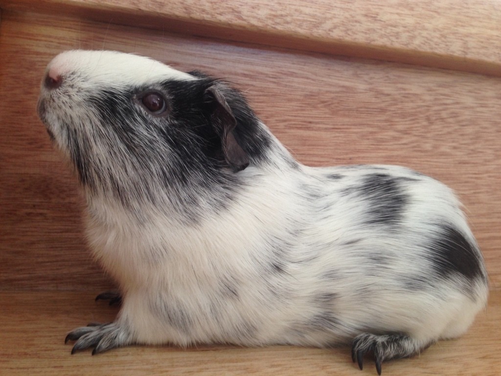 Both these boys are favourites of ours here at the shelter. They are striking (and charming). Harry is a tri-colour abyssinian and Storm is a black/white dalmatian. What a cool pair of piggies! Harry was rescued from a backyard where he lived free-range with 4 females (which, thanks to Harry, were all pregnant). Yes he is super smooth with the ladies (and with us). Storm was a sad solo guinea pig before being surrendered so he is very happy to have a buddy to be with now. He is a lovely little guy. They are great companions.