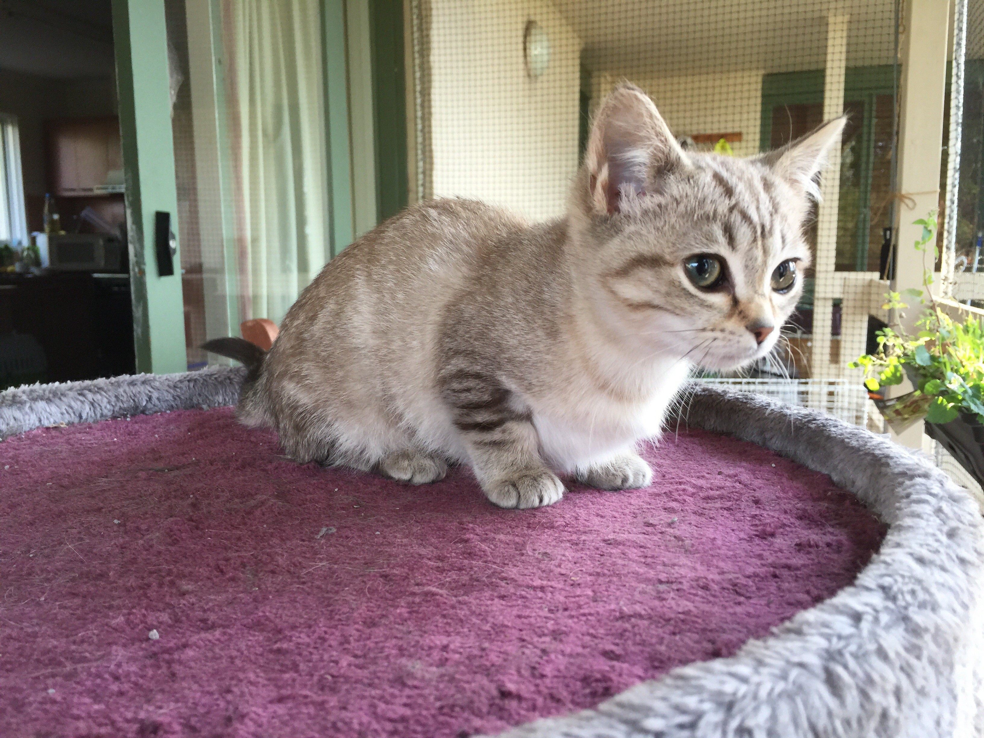 Being short of leg and also a unique little cat, Arrietty will not be able to be a free roaming cat in case she's snatched up by a more athletic animal or greedy person.