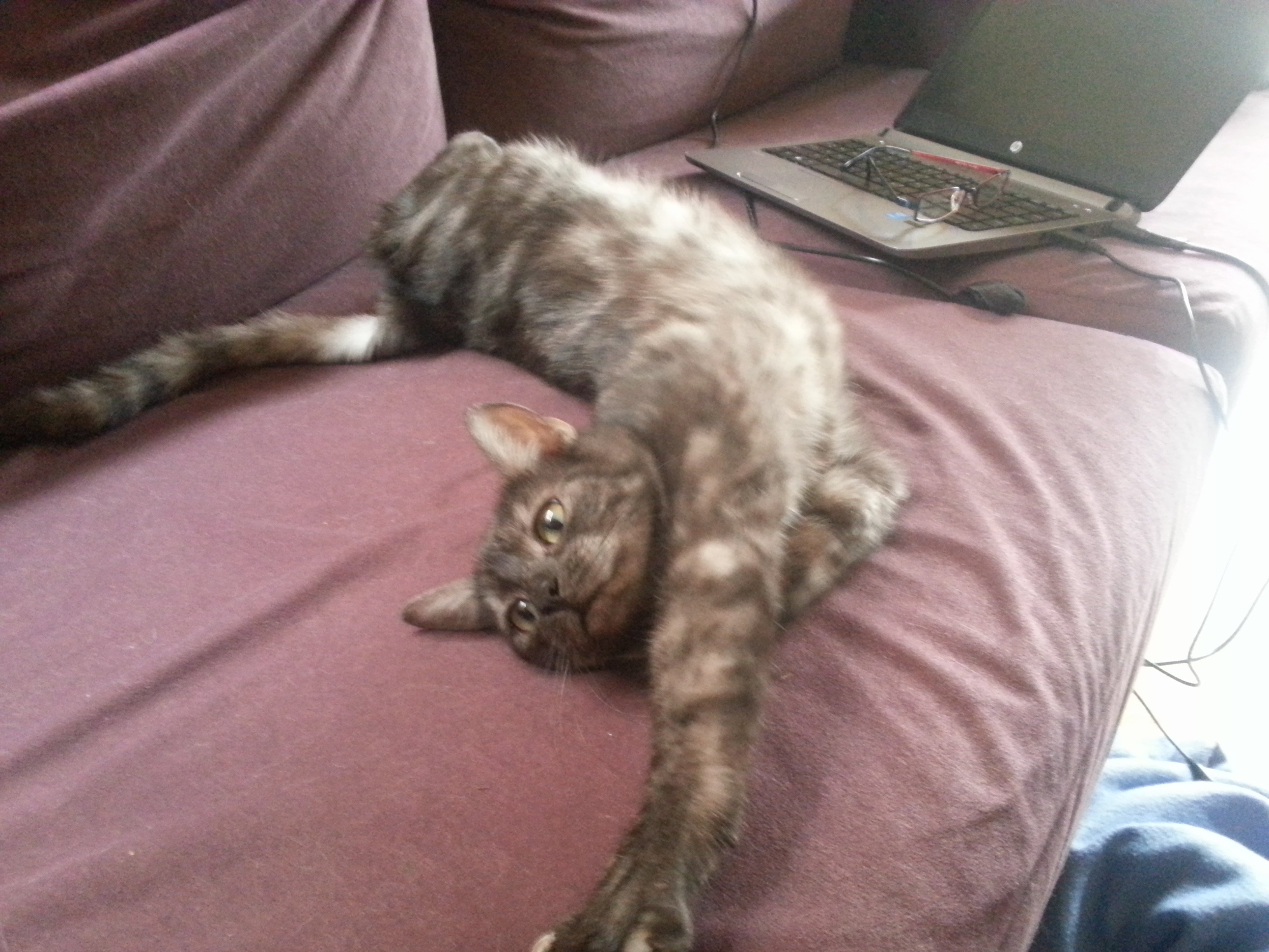 She is a bit like a puppy - she loves to find socks, gloves, hair-ties, steal them and bring them to play with on the couch. She is a very gentle sweet natured kitten, and will purr endlessly if you give her a pat. In fact, she will seek you out for pats and to sit on your lap, and will always find games to play with you.
