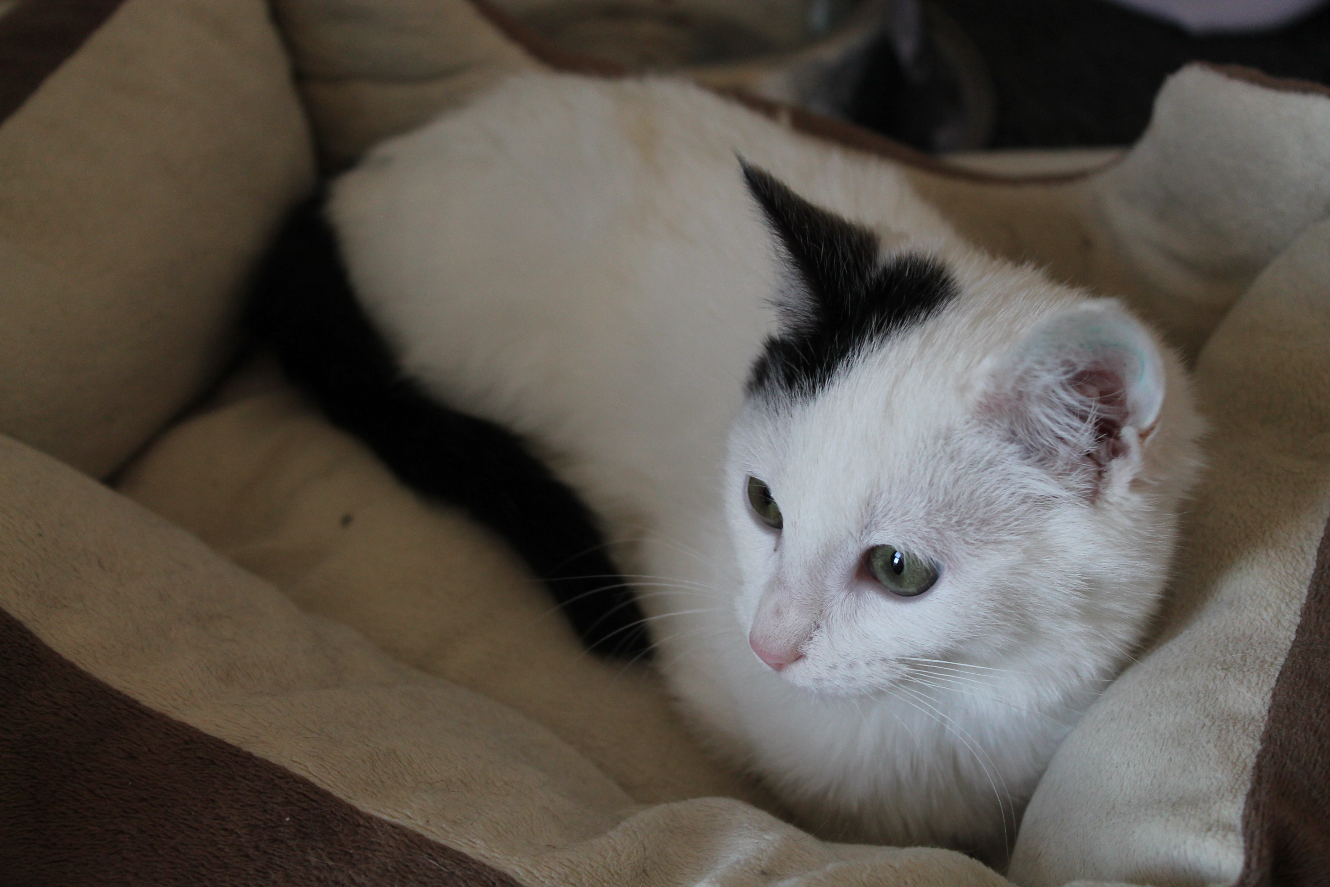He has a quiet nature and seems to keep to himself. He loves the soft bed and it's where I find him nearly every time I go into the kitten room. Snuggled into a little ball of cuteness! He worries when you stand over him (we look so big!) but if you sit on the ground and give him a pat he'll soon be purring his little head off. And once he trusts you (he takes a little time to understand he can trust you) he'll be all over you for pats and attention.