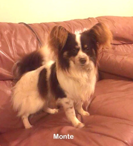 Monte is large for a Papillon, he's closer in size to a cavalier spaniel. He is social with people and other dogs, and is housetrained.
