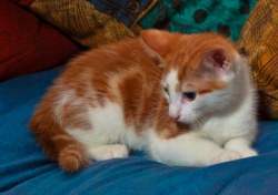 Nuggett is a very friendly kitten. He has the type of personality that you just can't help but love. He is affectionate, loves human company and once you have proven to him that he can trust you, he is yours forever. Nuggett is a little shy in the beginning, but once he gets to know you he is a playful, loving kitten. He would be better suited to a household where the kids are teenagers or out of the house