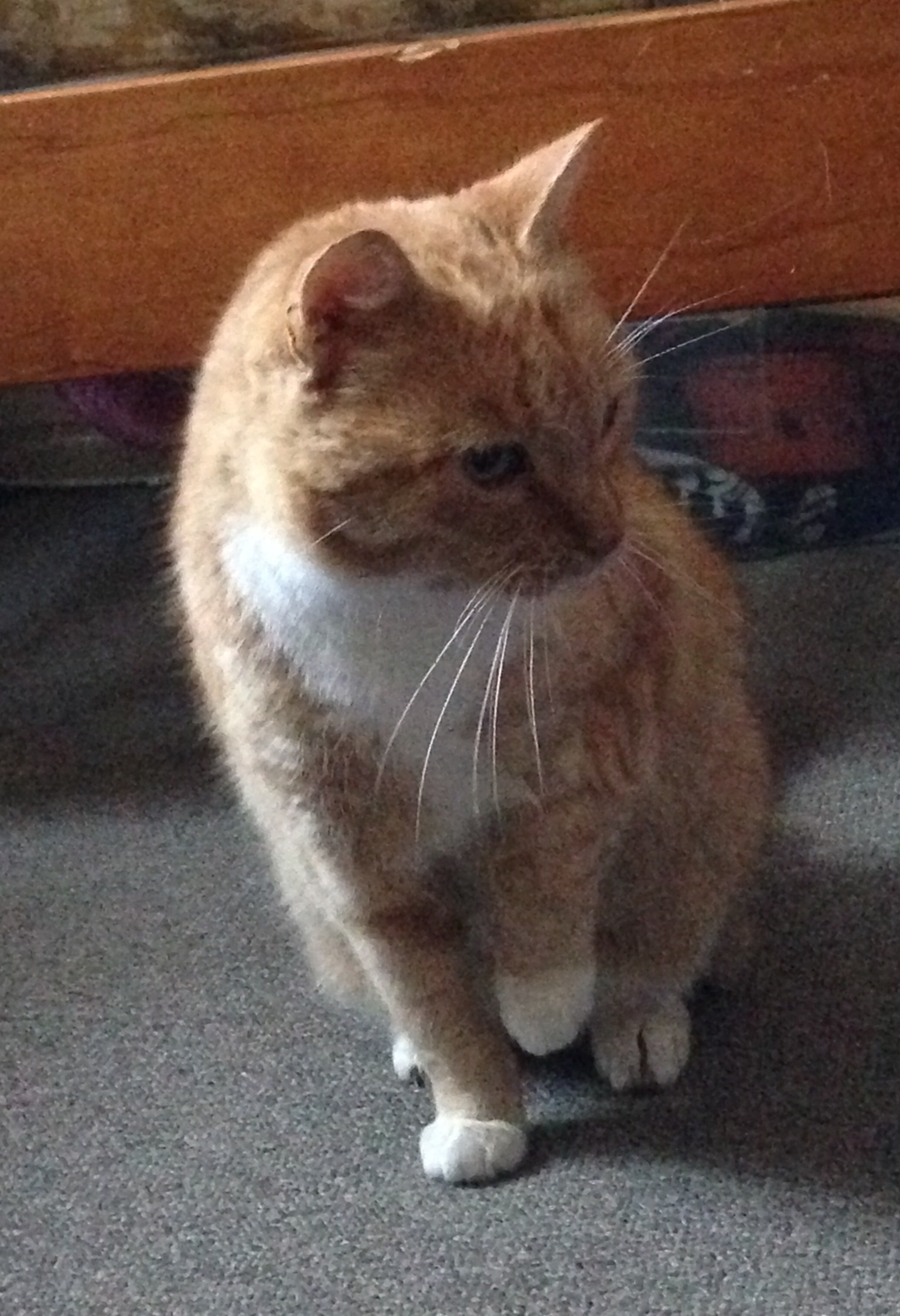He is not fond of being picked up, but this is something he will get better with, in time. He has a quirky habit of holding up one front paw when he's sitting, been checked by a vet and not a problem.