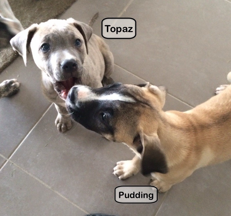 Topaz is a lovely blue-and-cream brindle colour. She is a playful and outgoing puppy.