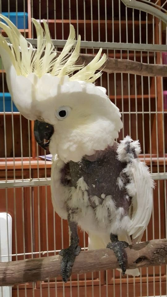 • Alex was placed in care with one our cockatoo foster carers, as the information provided by his previous owner was very limited, also we wanted to fully access his screaming/biting/feather plucking behaviours. He has been in care now since February.