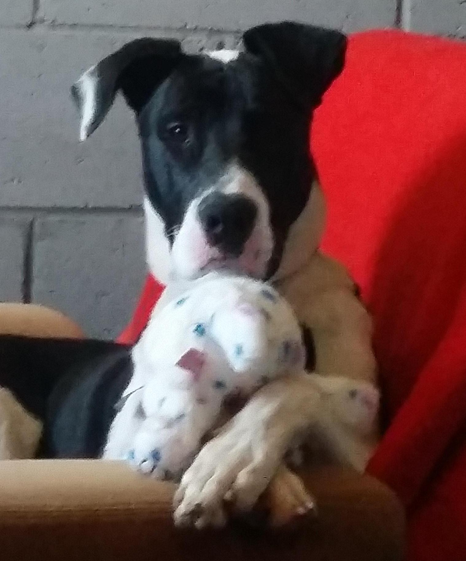 Rocky loves to play with toys. He regularly picks up toys and carries them around trying to pass them to whomever he sees. He hopes that his new owners will enjoy playing with him and his toys.