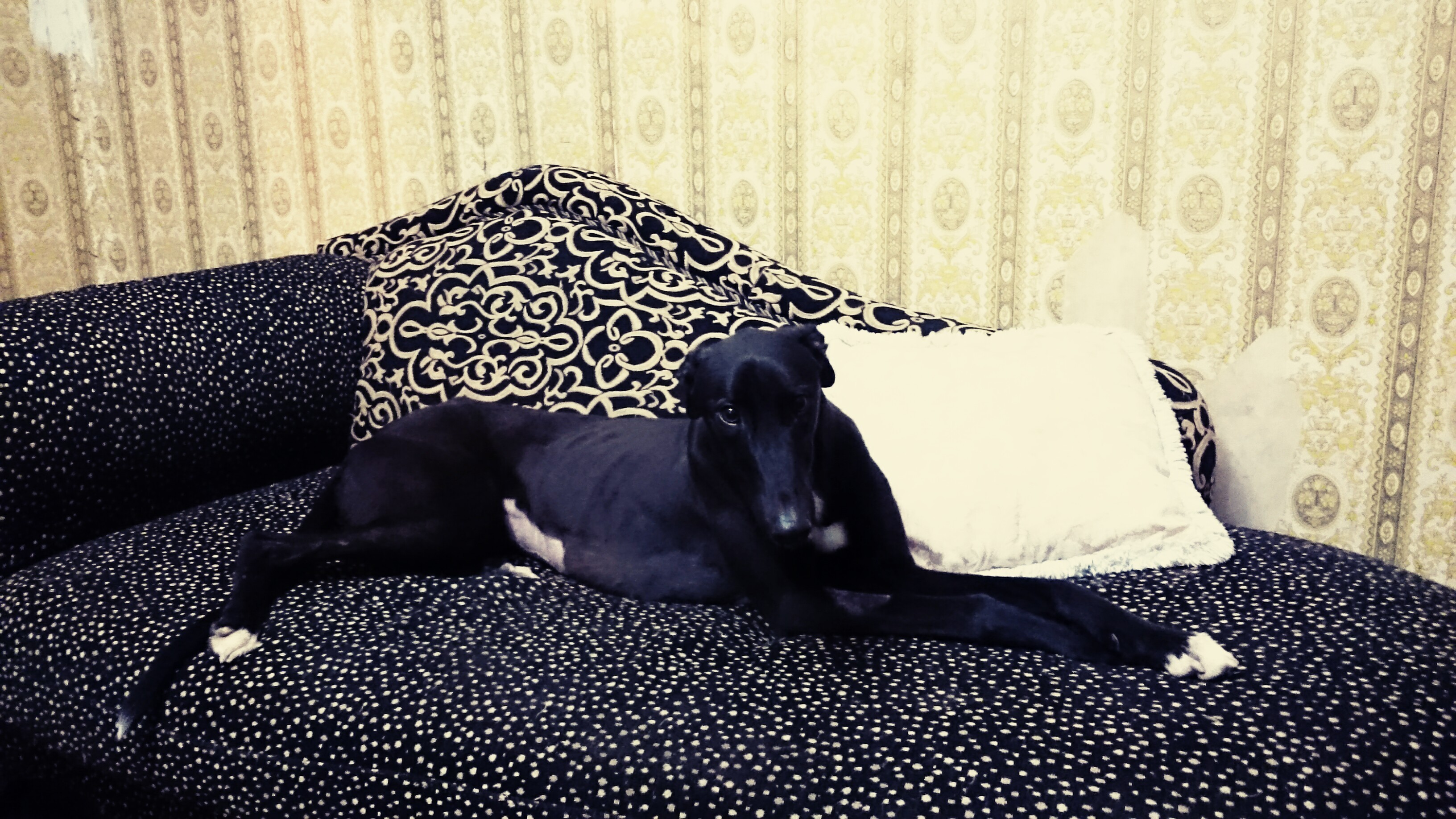 Mimi is a unique fur kid rescued from the track. She's a very sensitive, loyal dog and affectionate girl. She likes to be close with her humans and put her little face in their hands when possible.