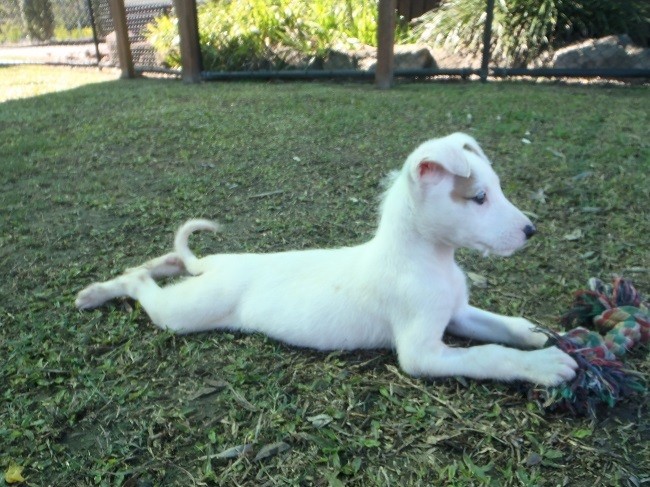 Hello, my name is Blanc. I am a 3 month old, female, Wolfhound mix. I am a sweet girl who loves to explore my new surroundings. As I am going to be a large girl, I will need a good diet to help my growing bones. Pop down to the Animal Management Centre for some cuddles!