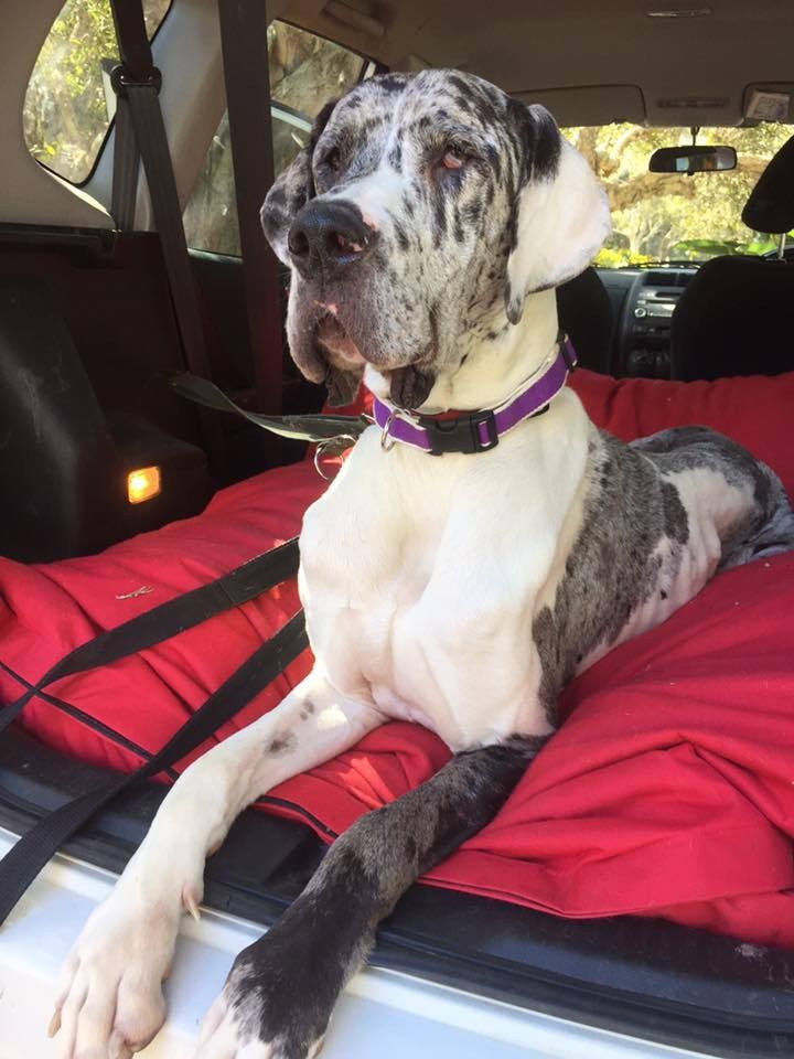 Elle is a stunning 3 year old Merle Mantle who is blossoming in foster care and learning to play with her foster brother. She has proved to be a talented sleeper, able to curl up in the smallest of couches. She has so much love to give and provides endless amounts of smooches for her foster parents. Elle is still young and spritely and would benefit from an active home and a family who could continue to teach her how to be less excitable around new people. Elle is untested with cats and kids.
