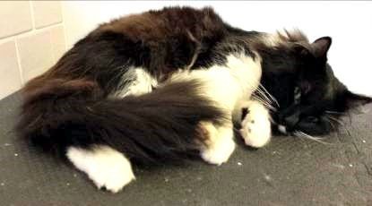 Mr Moo is a quiet guy, he won't bowl you over or throw himself at you, but show him even the slightest bit of attention and he is all yours. Pat his head, and he will roll on his back, arms up, legs down, his furry belly totally exposed waiting to be rubbed. He will just lie there absorbing all the kindness he can, he reminds me of a floppy doll I used to have as a child. His temperament is without fault, he is so, so gentle and he has this kindness about him, he has no hard feelings when you stop patting him, he just accepts it and sits by quietly. He has lovely thick fur and a sort of comical look to his face, that makes me smile when I think of him. He would need to be an inside cat, because of his docile nature, and I think he would make a very loyal companion.