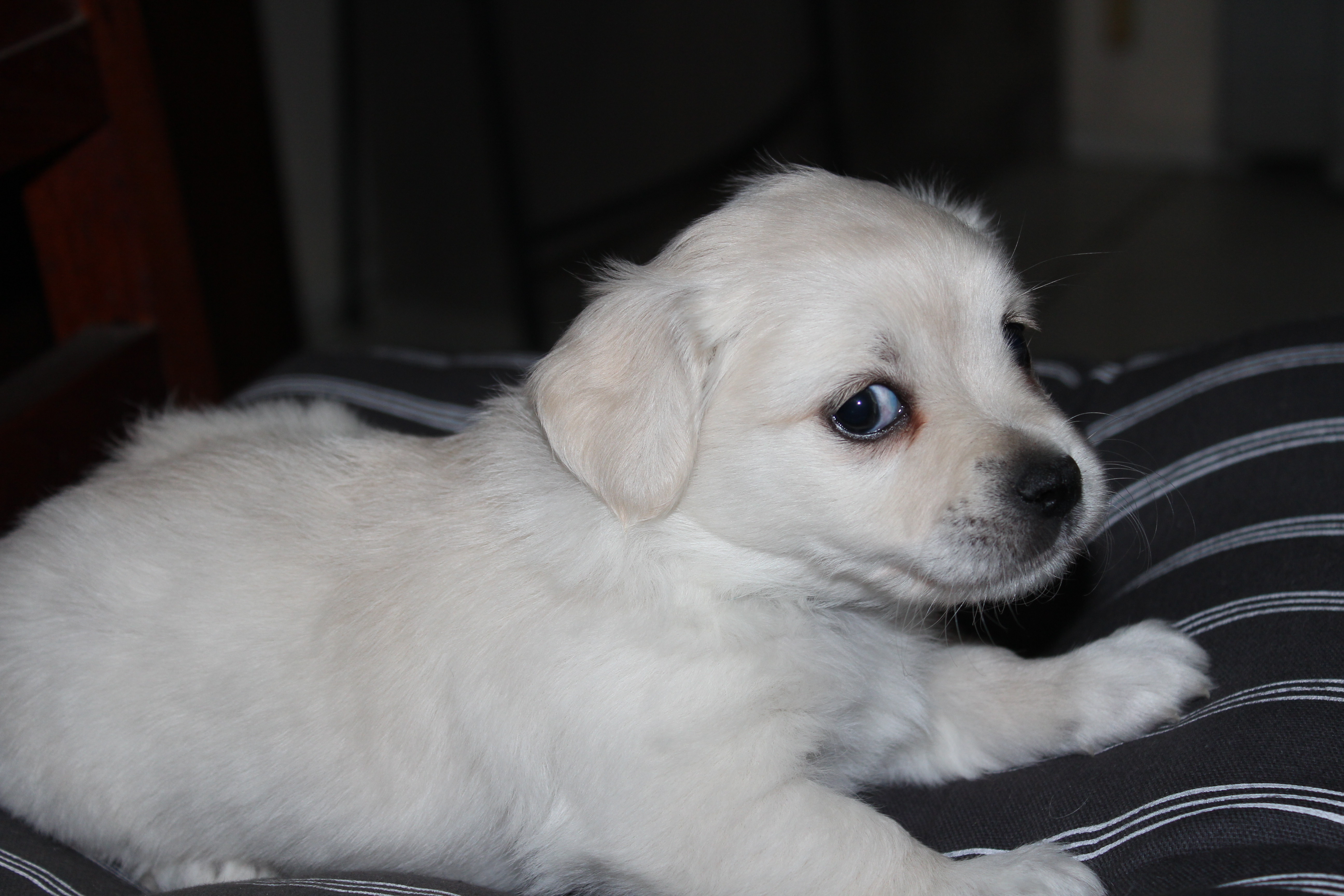 He is (we are told) Maltese x ShihTzu x Dachshund, but basically a gorgeous white fluffy boy that will be a small sized dog.