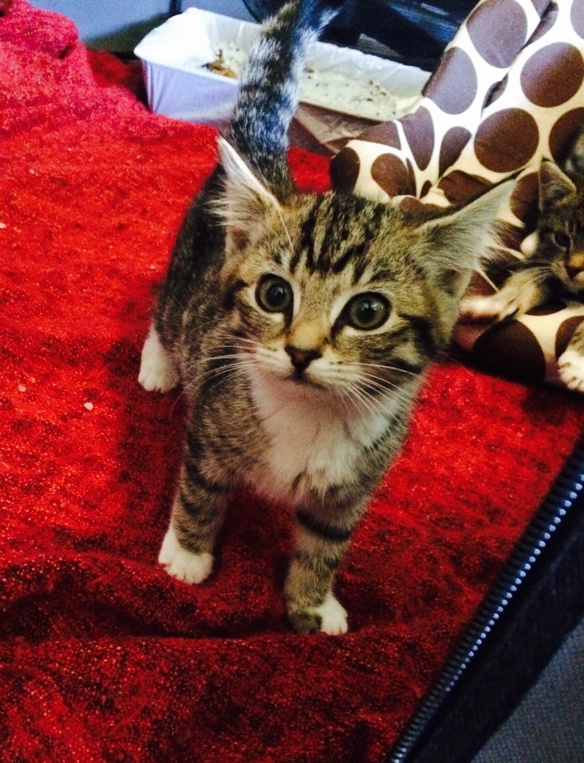 Maggie came into care with her brother who has since been adopted. Maggie loves to purr and explore and loves to sit on your lap. She is tabby and white and super cute. I shall upload more photos when available. She is constantly making us laugh with her antics.