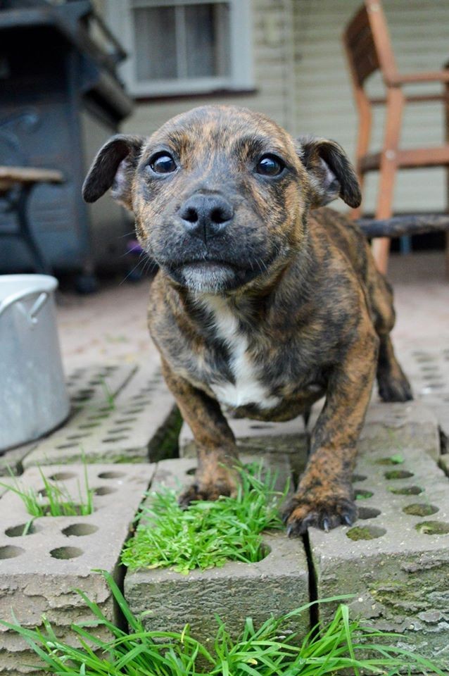 Tiger is a happy, food driven, chubby little tank, who would make an excellent pet for a couple or people with older children. He is learning not to "mouth" (use his mouth to get your attention - not biting) and is quite a bossy boots with his siblings. He is a typical staffy and barrell chested and stumpy legged and very cute. He doesn't mind a snuggle as long as there is no food that just HAS to be eaten!! He would play very well with older children (say over 5 years old) who are used to dogs and would benefit from some training and walks. He sleeps outside and is not yet house trained but would do anything for food so training should be easy!!