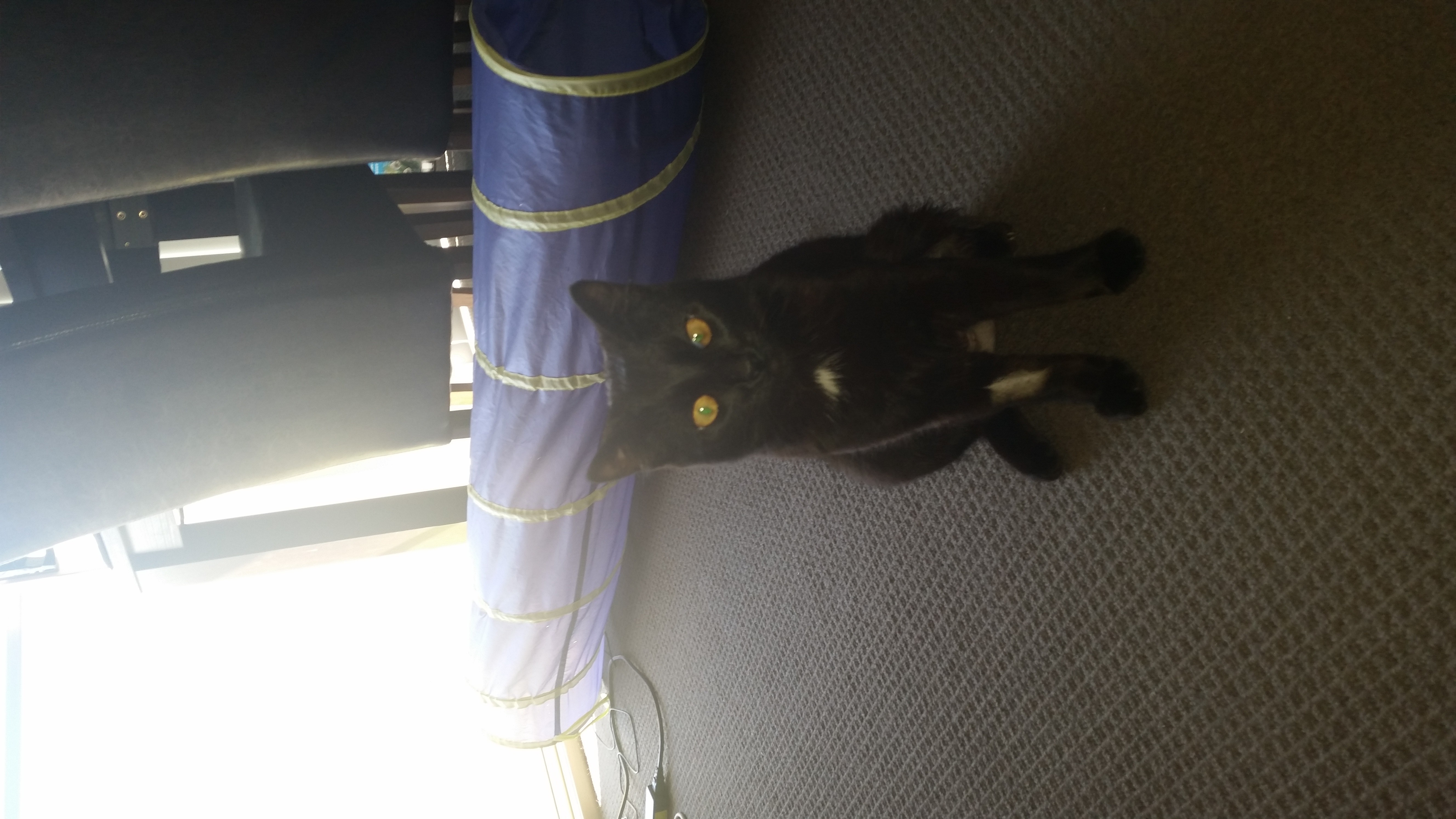 If you are looking for the purrfect kitten to add to your family, look no further than gorgeous little Ebony. As your typical kitten, she is playful and adventurous. However she also loves a good snuggle and will purr up a storm when she is happy. While she adores people, Ebony doesnt seem to enjoy the company of other cats, so a home where she can be the only kitten or a home with one other male cat would be ideal. Similarily, she doesn't take to dogs so outside dogs would be great. If you would love a kitten that has the best of both worlds, both playful and snuggly, Ebony is the kitten for you.