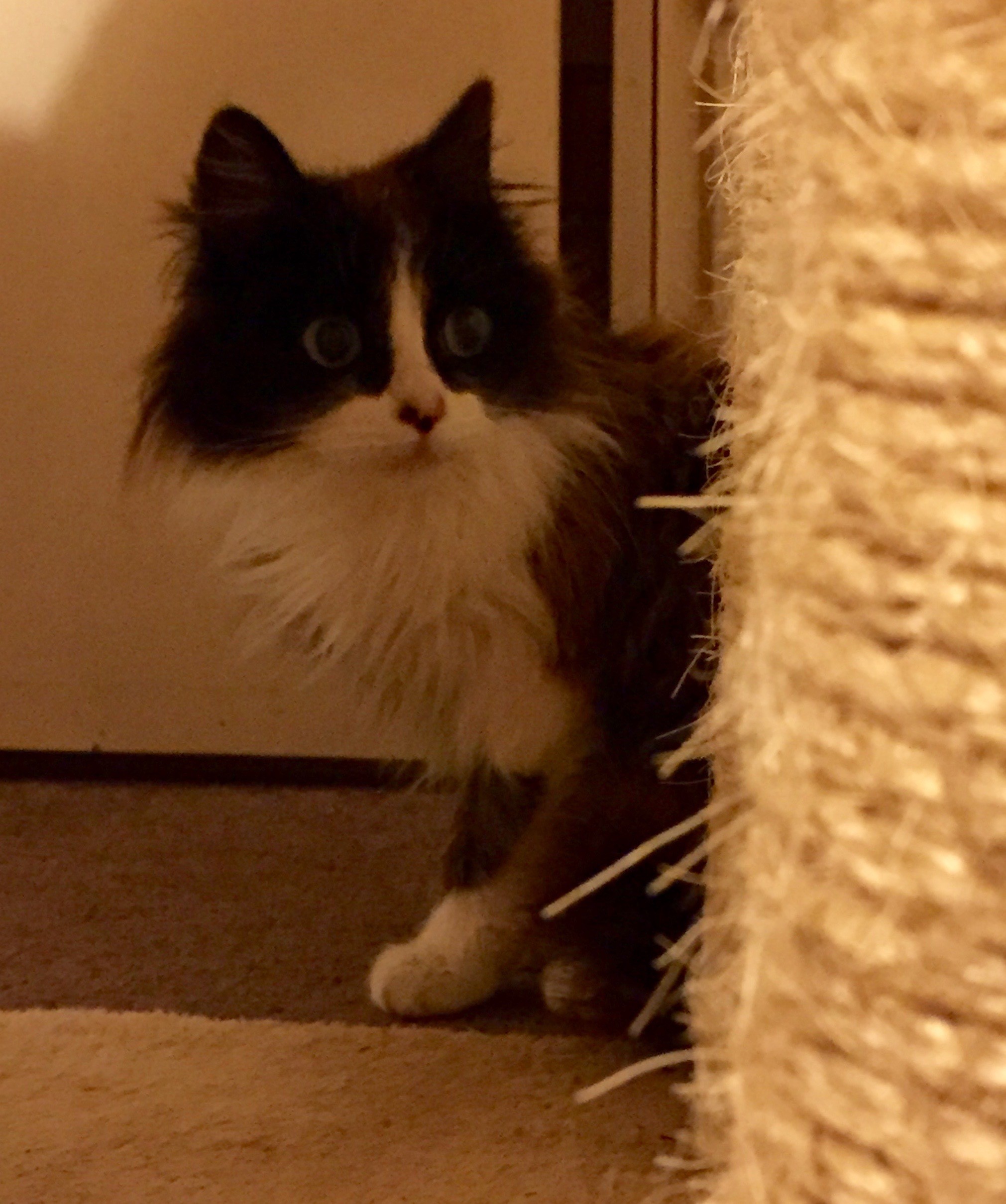 Hi there, my name is Kellie and Foster Mummy (FM) says my photos do me no justice. I'm a very petite ball of brown, black and white fluff. I have just come into care as I was dumped with all of my siblings and FM just cut all the burrs out of my beautiful coat. I'm quite shy but absolutely love when you pat me and will purr for ages. I am used to children and other cats and I have even met some dogs. I'm litter trained and love to climb my cat tree. I'd really love to find a forever home where I can shower my human with love.