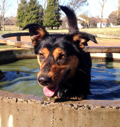 Swimming and kids are two of Min's favourite things. She is a waterbaby. Whether it's trough, a dam, a puddle or a dish, she loves it and will jump right in. The look on her face in the photo of her coming out of the dam says it all!