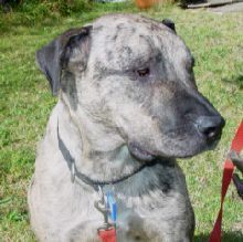 George is a super friendly, happy boy who just loves people. He is also good with cats and most dogs although he does like to be top male (so off-leash meetings with other large males should be minimised). He is the size of a small great dane and is still a bit of a pup at heart. He is well trained - he leads well, sits / drops / stays on command and lies quietly in the car. He has good manners around food and is a great watch dog. His favourite new game is fetch which makes him easy to exercise. George is much better looking than his photo shows. And the second picture is a better indication of his coat colour