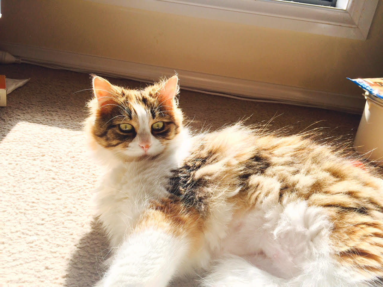 Her hobbies include eating, bird watching, snacking, sunbathing, and … did I mention eating … She is constantly convinced that she needs food – she will happily show you where her food is, and lead you to her bowl, informing you of her level of near desperate hunger as she goes. Probably her most vocal time.