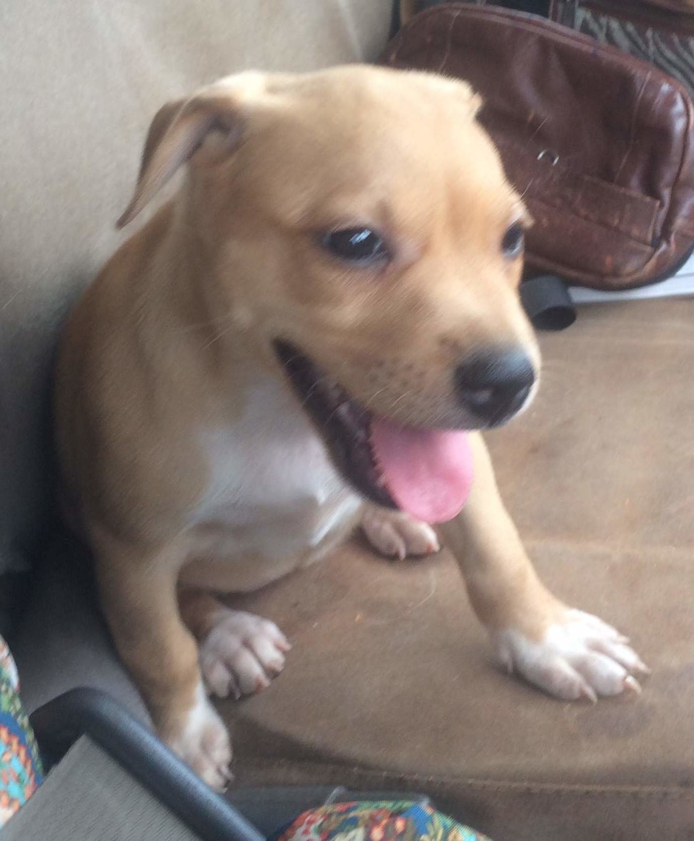 Wonderful happy, confident puppy. We have no idea of her breed so make a guess of Staffy, kelpie????? This is because she has a sturdy stocky body with longer legs than a staffy would have. Her paws are not large so we estimate a medium sized dog.